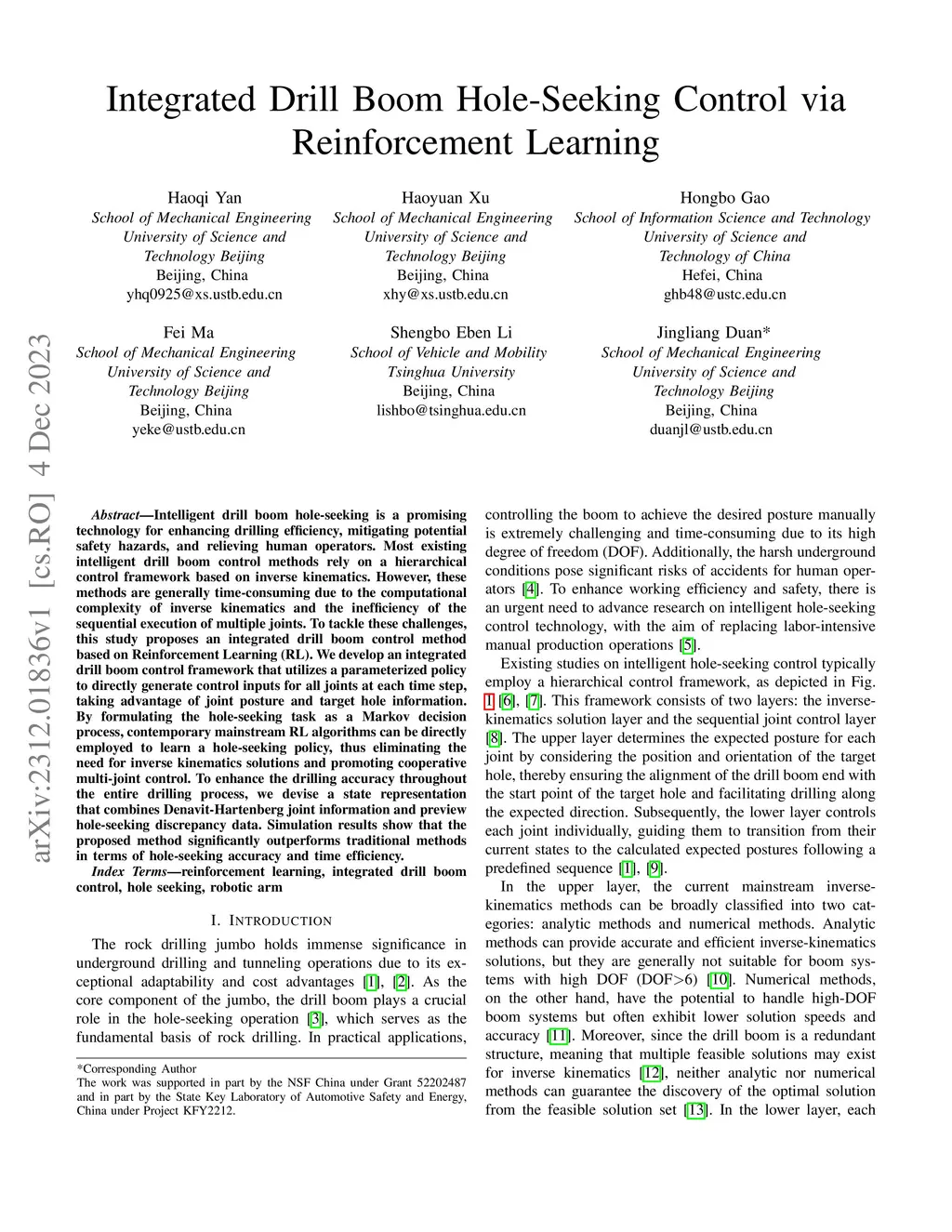 Integrated Drill Boom Hole-Seeking Control via Reinforcement Learning