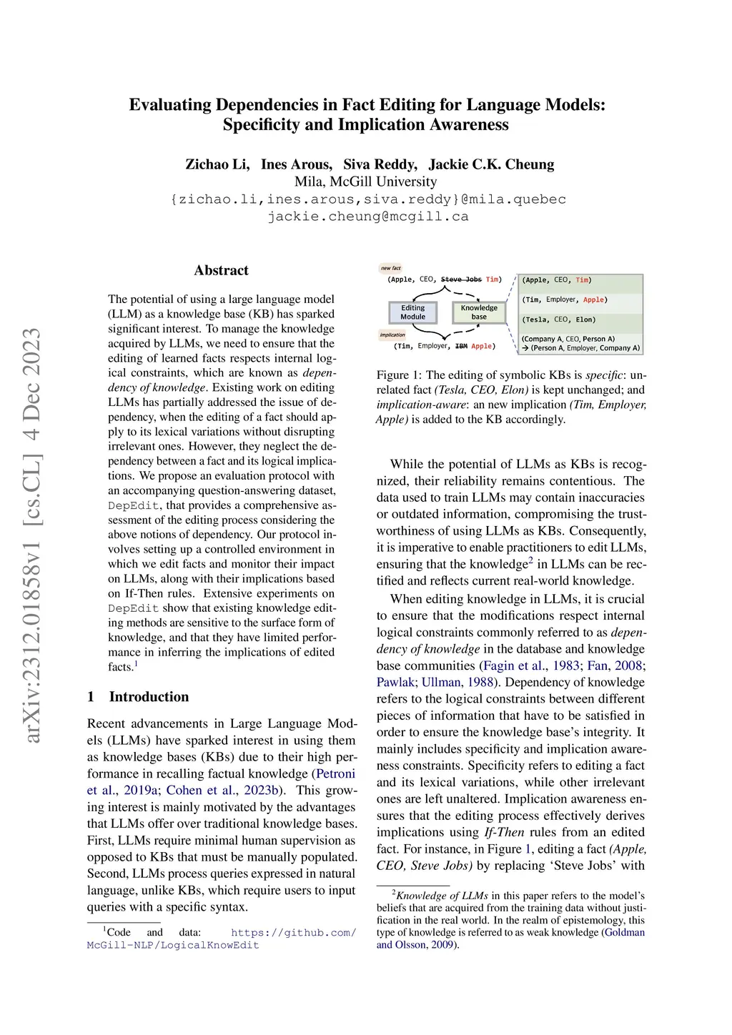 The potential of using a large language model (LLM) as a knowledge base (KB) has sparked significant interest. To manage the knowledge acquired by LLMs, we need to ensure that the editing of learned facts respects internal logical constraints, which are known as dependency of knowledge. Existing work on editing LLMs has partially addressed the issue of dependency, when the editing of a fact should apply to its lexical variations without disrupting irrelevant ones. However, they neglect the dependency between a fact and its logical implications. We propose an evaluation protocol with an accompanying question-answering dataset, DepEdit, that provides a comprehensive assessment of the editing process considering the above notions of dependency. Our protocol involves setting up a controlled environment in which we edit facts and monitor their impact on LLMs, along with their implications based on If-Then rules. Extensive experiments on DepEdit show that existing knowledge editing methods are sensitive to the surface form of knowledge, and that they have limited performance in inferring the implications of edited facts.