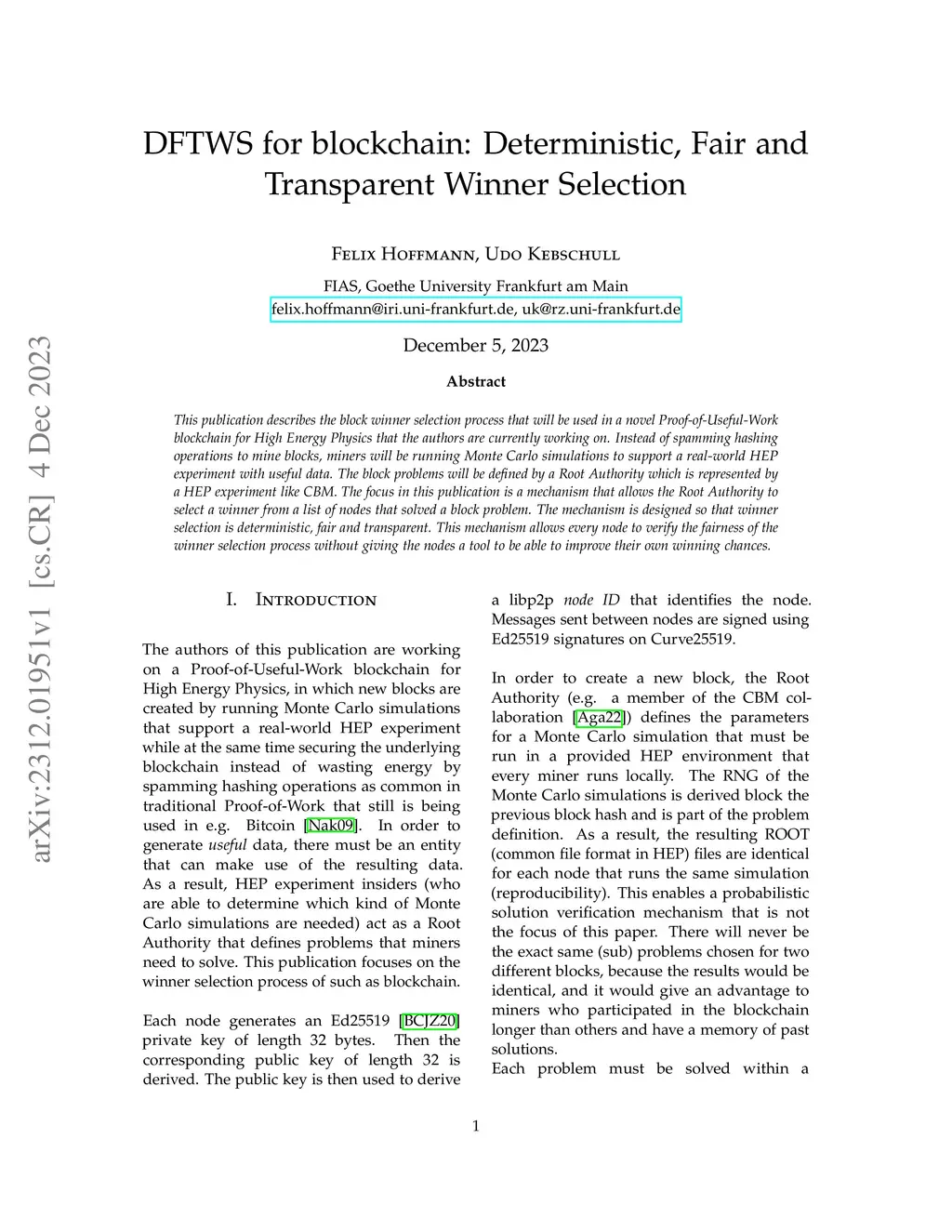 This publication describes the block winner selection process that will be used in a novel Proof-of-Useful-Work blockchain for High Energy Physics that the authors are currently working on. Instead of spamming hashing operations to mine blocks, miners will be running Monte Carlo simulations to support a real-world HEP experiment with useful data. The block problems will be defined by a Root Authority which is represented by a HEP experiment like CBM. The focus in this publication is a mechanism that allows the Root Authority to select a winner from a list of nodes that solved a block problem. The mechanism is designed so that winner selection is deterministic, fair and transparent. This mechanism allows every node to verify the fairness of the winner selection process without giving the nodes a tool to be able to improve their own winning chances.