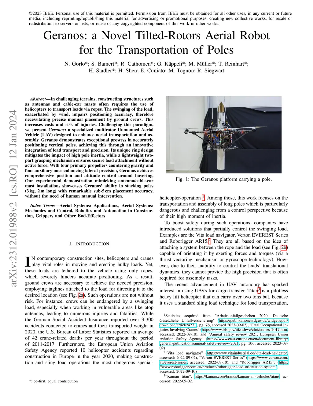 Geranos: a Novel Tilted-Rotors Aerial Robot for the Transportation of Poles