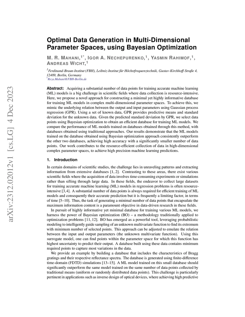 Acquiring a substantial number of data points for training accurate machine learning (ML) models is a big challenge in scientific fields where data collection is resource-intensive. Here, we propose a novel approach for constructing a minimal yet highly informative database for training ML models in complex multi-dimensional parameter spaces. To achieve this, we mimic the underlying relation between the output and input parameters using Gaussian process regression (GPR). Using a set of known data, GPR provides predictive means and standard deviation for the unknown data. Given the predicted standard deviation by GPR, we select data points using Bayesian optimization to obtain an efficient database for training ML models. We compare the performance of ML models trained on databases obtained through this method, with databases obtained using traditional approaches. Our results demonstrate that the ML models trained on the database obtained using Bayesian optimization approach consistently outperform the other two databases, achieving high accuracy with a significantly smaller number of data points. Our work contributes to the resource-efficient collection of data in high-dimensional complex parameter spaces, to achieve high precision machine learning predictions.