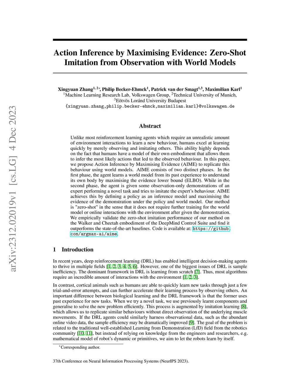 Unlike most reinforcement learning agents which require an unrealistic amount of environment interactions to learn a new behaviour, humans excel at learning quickly by merely observing and imitating others. This ability highly depends on the fact that humans have a model of their own embodiment that allows them to infer the most likely actions that led to the observed behaviour. In this paper, we propose Action Inference by Maximising Evidence (AIME) to replicate this behaviour using world models. AIME consists of two distinct phases. In the first phase, the agent learns a world model from its past experience to understand its own body by maximising the ELBO. While in the second phase, the agent is given some observation-only demonstrations of an expert performing a novel task and tries to imitate the expert's behaviour. AIME achieves this by defining a policy as an inference model and maximising the evidence of the demonstration under the policy and world model. Our method is "zero-shot" in the sense that it does not require further training for the world model or online interactions with the environment after given the demonstration. We empirically validate the zero-shot imitation performance of our method on the Walker and Cheetah embodiment of the DeepMind Control Suite and find it outperforms the state-of-the-art baselines. Code is available at: https://github.com/argmax-ai/aime.