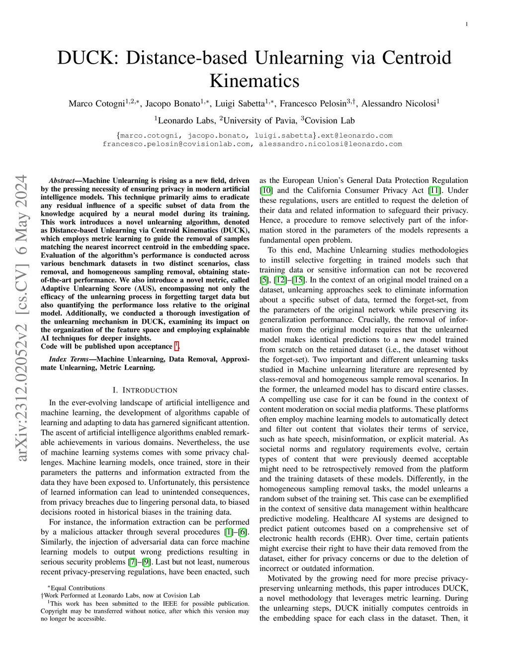 Machine Unlearning is rising as a new field, driven by the pressing necessity of ensuring privacy in modern artificial intelligence models. This technique primarily aims to eradicate any residual influence of a specific subset of data from the knowledge acquired by a neural model during its training. This work introduces a novel unlearning algorithm, denoted as Distance-based Unlearning via Centroid Kinematics (DUCK), which employs metric learning to guide the removal of samples matching the nearest incorrect centroid in the embedding space. Evaluation of the algorithm's performance is conducted across various benchmark datasets in two distinct scenarios, class removal, and homogeneous sampling removal, obtaining state-of-the-art performance. We also introduce a novel metric, called Adaptive Unlearning Score (AUS), encompassing not only the efficacy of the unlearning process in forgetting target data but also quantifying the performance loss relative to the original model. Additionally, we conducted a thorough investigation of the unlearning mechanism in DUCK, examining its impact on the organization of the feature space and employing explainable AI techniques for deeper insights.