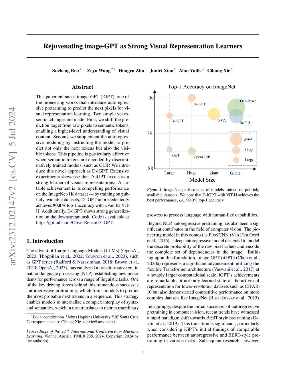 This paper enhances image-GPT (iGPT), one of the pioneering works that introduce autoregressive pretraining to predict the next pixels for visual representation learning. Two simple yet essential changes are made. First, we shift the prediction target from raw pixels to semantic tokens, enabling a higher-level understanding of visual content. Second, we supplement the autoregressive modeling by instructing the model to predict not only the next tokens but also the visible tokens. This pipeline is particularly effective when semantic tokens are encoded by discriminatively trained models, such as CLIP. We introduce this novel approach as D-iGPT. Extensive experiments showcase that D-iGPT excels as a strong learner of visual representations: A notable achievement is its compelling performance on the ImageNet-1K dataset -- by training on publicly available datasets, D-iGPT unprecedentedly achieves \textbf{90.0\%} top-1 accuracy with a vanilla ViT-H. Additionally, D-iGPT shows strong generalization on the downstream task. Code is available at https://github.com/OliverRensu/D-iGPT.