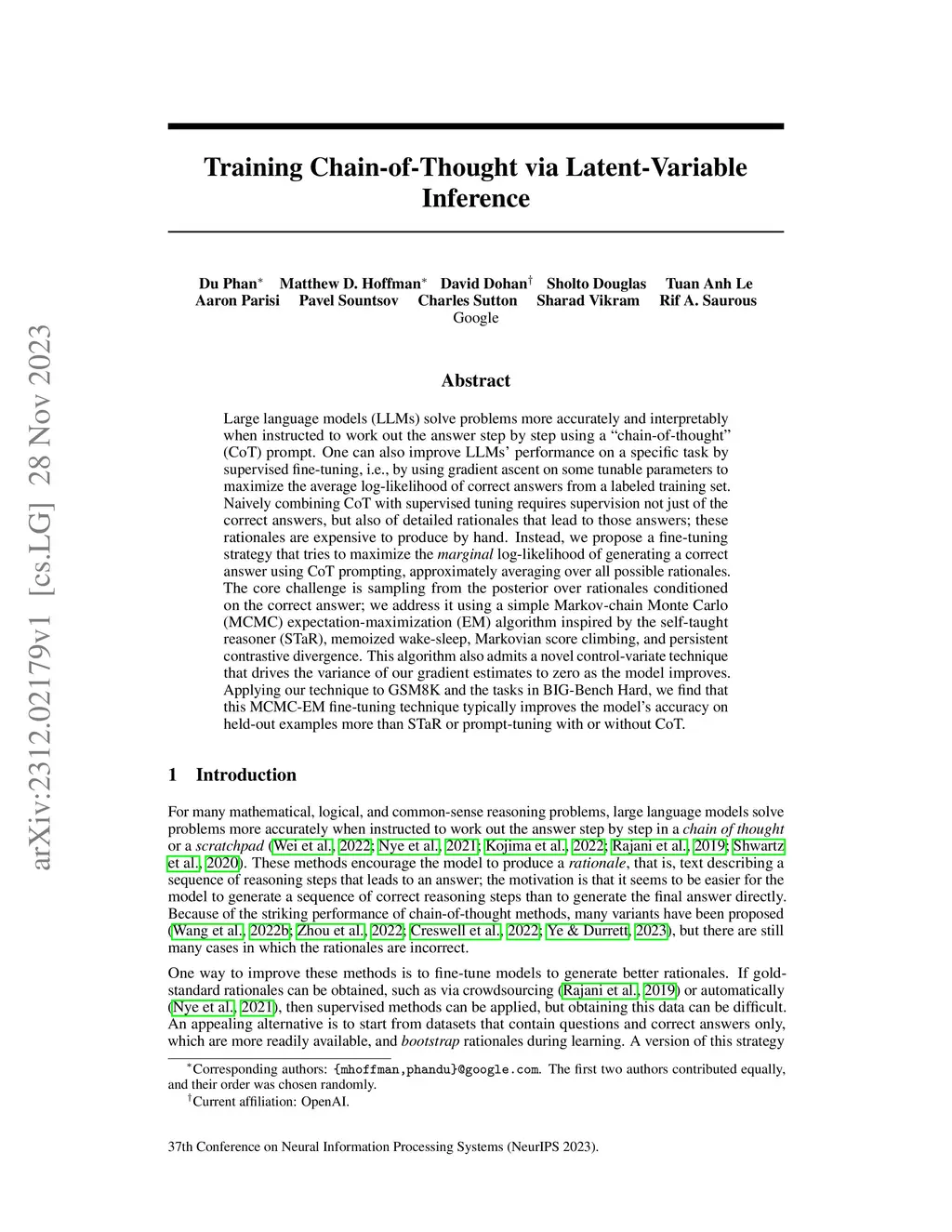 Large language models (LLMs) solve problems more accurately and interpretably when instructed to work out the answer step by step using a ``chain-of-thought'' (CoT) prompt. One can also improve LLMs' performance on a specific task by supervised fine-tuning, i.e., by using gradient ascent on some tunable parameters to maximize the average log-likelihood of correct answers from a labeled training set. Naively combining CoT with supervised tuning requires supervision not just of the correct answers, but also of detailed rationales that lead to those answers; these rationales are expensive to produce by hand. Instead, we propose a fine-tuning strategy that tries to maximize the \emph{marginal} log-likelihood of generating a correct answer using CoT prompting, approximately averaging over all possible rationales. The core challenge is sampling from the posterior over rationales conditioned on the correct answer; we address it using a simple Markov-chain Monte Carlo (MCMC) expectation-maximization (EM) algorithm inspired by the self-taught reasoner (STaR), memoized wake-sleep, Markovian score climbing, and persistent contrastive divergence. This algorithm also admits a novel control-variate technique that drives the variance of our gradient estimates to zero as the model improves. Applying our technique to GSM8K and the tasks in BIG-Bench Hard, we find that this MCMC-EM fine-tuning technique typically improves the model's accuracy on held-out examples more than STaR or prompt-tuning with or without CoT.