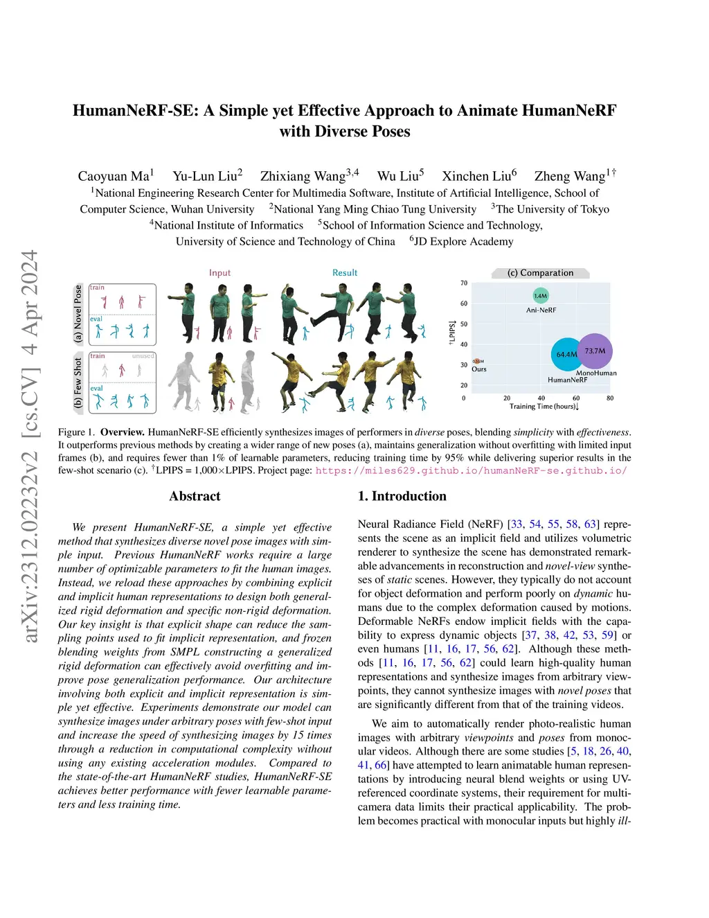 We present HumanNeRF-SE, a simple yet effective method that synthesizes diverse novel pose images with simple input. Previous HumanNeRF works require a large number of optimizable parameters to fit the human images. Instead, we reload these approaches by combining explicit and implicit human representations to design both generalized rigid deformation and specific non-rigid deformation. Our key insight is that explicit shape can reduce the sampling points used to fit implicit representation, and frozen blending weights from SMPL constructing a generalized rigid deformation can effectively avoid overfitting and improve pose generalization performance. Our architecture involving both explicit and implicit representation is simple yet effective. Experiments demonstrate our model can synthesize images under arbitrary poses with few-shot input and increase the speed of synthesizing images by 15 times through a reduction in computational complexity without using any existing acceleration modules. Compared to the state-of-the-art HumanNeRF studies, HumanNeRF-SE achieves better performance with fewer learnable parameters and less training time.