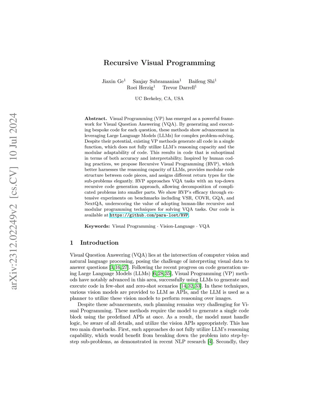 Visual Programming (VP) has emerged as a powerful framework for Visual Question Answering (VQA). By generating and executing bespoke code for each question, these methods demonstrate impressive compositional and reasoning capabilities, especially in few-shot and zero-shot scenarios. However, existing VP methods generate all code in a single function, resulting in code that is suboptimal in terms of both accuracy and interpretability. Inspired by human coding practices, we propose Recursive Visual Programming (RVP), which simplifies generated routines, provides more efficient problem solving, and can manage more complex data structures. RVP is inspired by human coding practices and approaches VQA tasks with an iterative recursive code generation approach, allowing decomposition of complicated problems into smaller parts. Notably, RVP is capable of dynamic type assignment, i.e., as the system recursively generates a new piece of code, it autonomously determines the appropriate return type and crafts the requisite code to generate that output. We show RVP's efficacy through extensive experiments on benchmarks including VSR, COVR, GQA, and NextQA, underscoring the value of adopting human-like recursive and modular programming techniques for solving VQA tasks through coding.