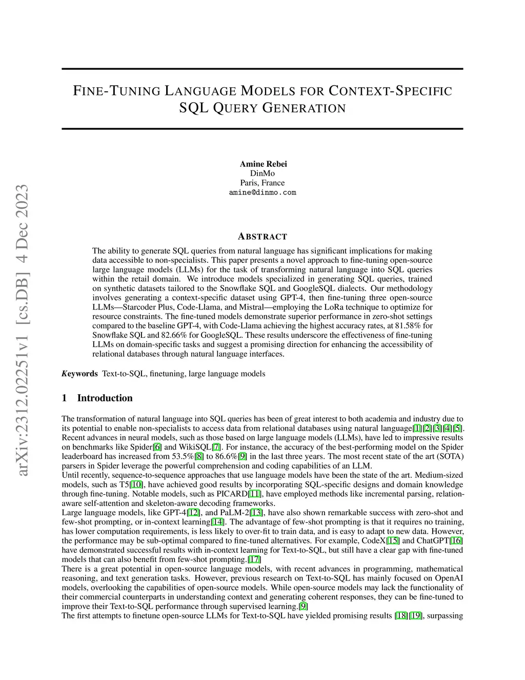 The ability to generate SQL queries from natural language has significant implications for making data accessible to non-specialists. This paper presents a novel approach to fine-tuning open-source large language models (LLMs) for the task of transforming natural language into SQL queries within the retail domain. We introduce models specialized in generating SQL queries, trained on synthetic datasets tailored to the Snowflake SQL and GoogleSQL dialects. Our methodology involves generating a context-specific dataset using GPT-4, then fine-tuning three open-source LLMs(Starcoder Plus, Code-Llama, and Mistral) employing the LoRa technique to optimize for resource constraints. The fine-tuned models demonstrate superior performance in zero-shot settings compared to the baseline GPT-4, with Code-Llama achieving the highest accuracy rates, at 81.58% for Snowflake SQL and 82.66% for GoogleSQL. These results underscore the effectiveness of fine-tuning LLMs on domain-specific tasks and suggest a promising direction for enhancing the accessibility of relational databases through natural language interfaces.