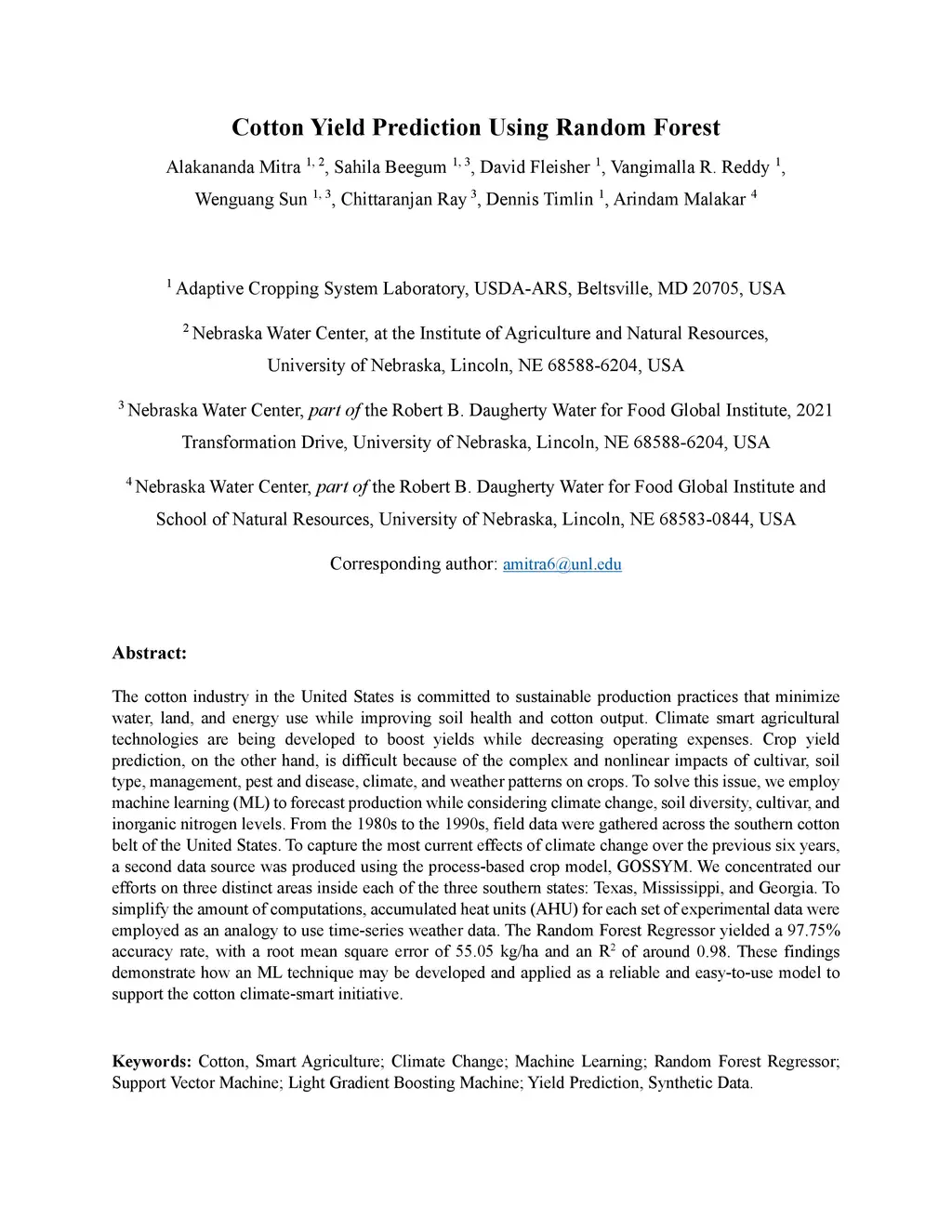 The cotton industry in the United States is committed to sustainable production practices that minimize water, land, and energy use while improving soil health and cotton output. Climate-smart agricultural technologies are being developed to boost yields while decreasing operating expenses. Crop yield prediction, on the other hand, is difficult because of the complex and nonlinear impacts of cultivar, soil type, management, pest and disease, climate, and weather patterns on crops. To solve this issue, we employ machine learning (ML) to forecast production while considering climate change, soil diversity, cultivar, and inorganic nitrogen levels. From the 1980s to the 1990s, field data were gathered across the southern cotton belt of the United States. To capture the most current effects of climate change over the previous six years, a second data source was produced using the process-based crop model, GOSSYM. We concentrated our efforts on three distinct areas inside each of the three southern states: Texas, Mississippi, and Georgia. To simplify the amount of computations, accumulated heat units (AHU) for each set of experimental data were employed as an analogy to use time-series weather data. The Random Forest Regressor yielded a 97.75% accuracy rate, with a root mean square error of 55.05 kg/ha and an R2 of around 0.98. These findings demonstrate how an ML technique may be developed and applied as a reliable and easy-to-use model to support the cotton climate-smart initiative.