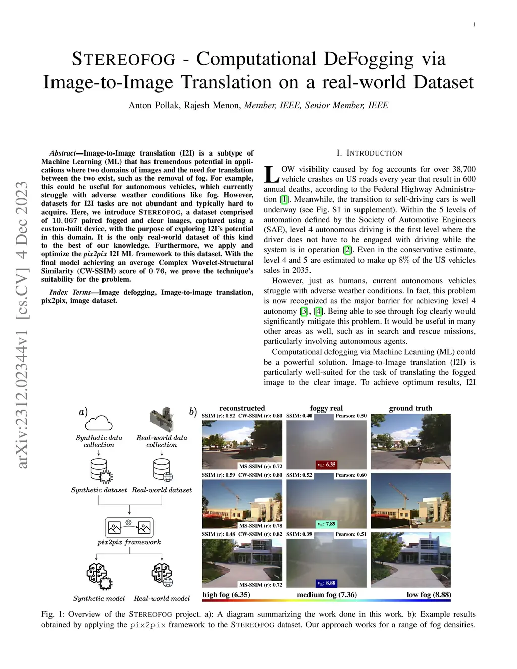 STEREOFOG -- Computational DeFogging via Image-to-Image Translation on a