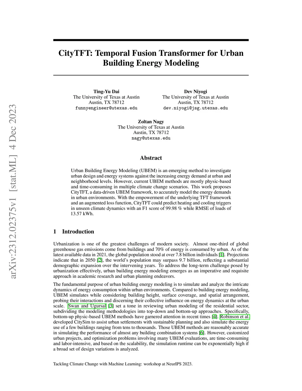 Urban Building Energy Modeling (UBEM) is an emerging method to investigate urban design and energy systems against the increasing energy demand at urban and neighborhood levels. However, current UBEM methods are mostly physic-based and time-consuming in multiple climate change scenarios. This work proposes CityTFT, a data-driven UBEM framework, to accurately model the energy demands in urban environments. With the empowerment of the underlying TFT framework and an augmented loss function, CityTFT could predict heating and cooling triggers in unseen climate dynamics with an F1 score of 99.98 \% while RMSE of loads of 13.57 kWh.