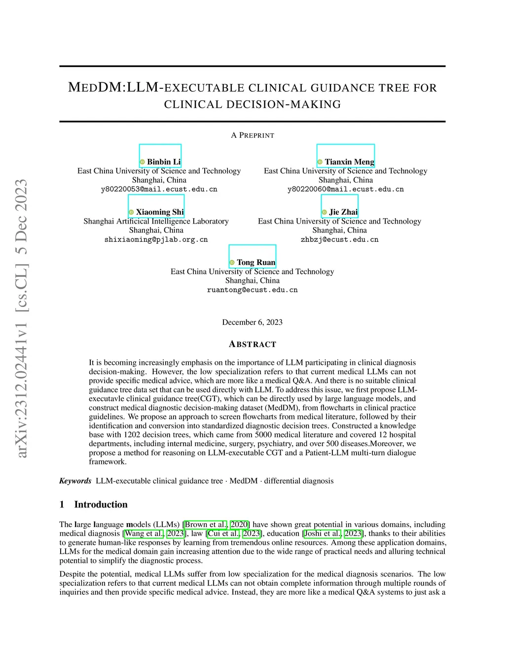 It is becoming increasingly emphasis on the importance of LLM participating in clinical diagnosis decision-making. However, the low specialization refers to that current medical LLMs can not provide specific medical advice, which are more like a medical Q\&A. And there is no suitable clinical guidance tree data set that can be used directly with LLM. To address this issue, we first propose LLM-executavle clinical guidance tree(CGT), which can be directly used by large language models, and construct medical diagnostic decision-making dataset (MedDM), from flowcharts in clinical practice guidelines. We propose an approach to screen flowcharts from medical literature, followed by their identification and conversion into standardized diagnostic decision trees. Constructed a knowledge base with 1202 decision trees, which came from 5000 medical literature and covered 12 hospital departments, including internal medicine, surgery, psychiatry, and over 500 diseases.Moreover, we propose a method for reasoning on LLM-executable CGT and a Patient-LLM multi-turn dialogue framework.