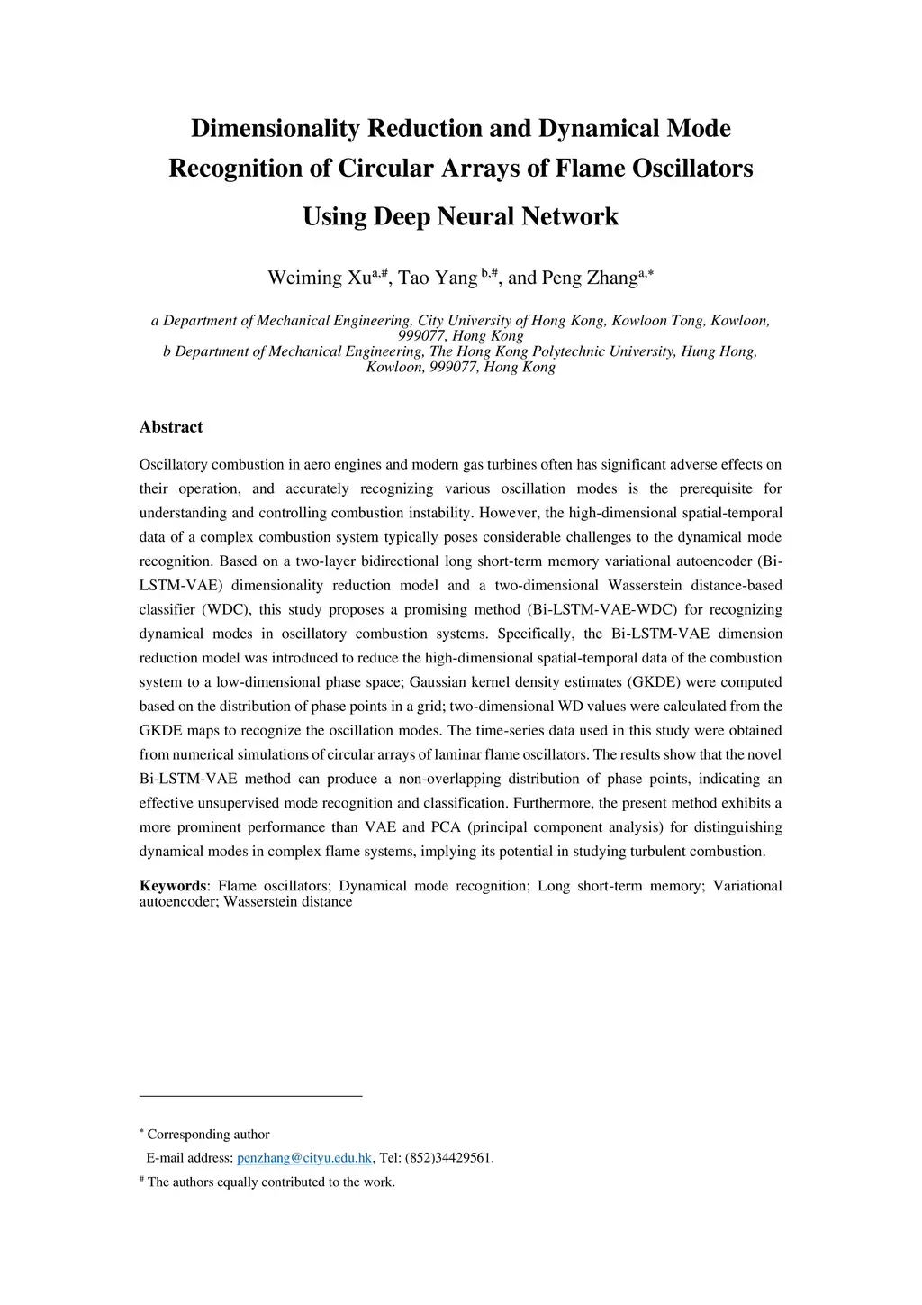Oscillatory combustion in aero engines and modern gas turbines often has significant adverse effects on their operation, and accurately recognizing various oscillation modes is the prerequisite for understanding and controlling combustion instability. However, the high-dimensional spatial-temporal data of a complex combustion system typically poses considerable challenges to the dynamical mode recognition. Based on a two-layer bidirectional long short-term memory variational autoencoder (Bi-LSTM-VAE) dimensionality reduction model and a two-dimensional Wasserstein distance-based classifier (WDC), this study proposes a promising method (Bi-LSTM-VAE-WDC) for recognizing dynamical modes in oscillatory combustion systems. Specifically, the Bi-LSTM-VAE dimension reduction model was introduced to reduce the high-dimensional spatial-temporal data of the combustion system to a low-dimensional phase space; Gaussian kernel density estimates (GKDE) were computed based on the distribution of phase points in a grid; two-dimensional WD values were calculated from the GKDE maps to recognize the oscillation modes. The time-series data used in this study were obtained from numerical simulations of circular arrays of laminar flame oscillators. The results show that the novel Bi-LSTM-VAE method can produce a non-overlapping distribution of phase points, indicating an effective unsupervised mode recognition and classification. Furthermore, the present method exhibits a more prominent performance than VAE and PCA (principal component analysis) for distinguishing dynamical modes in complex flame systems, implying its potential in studying turbulent combustion.