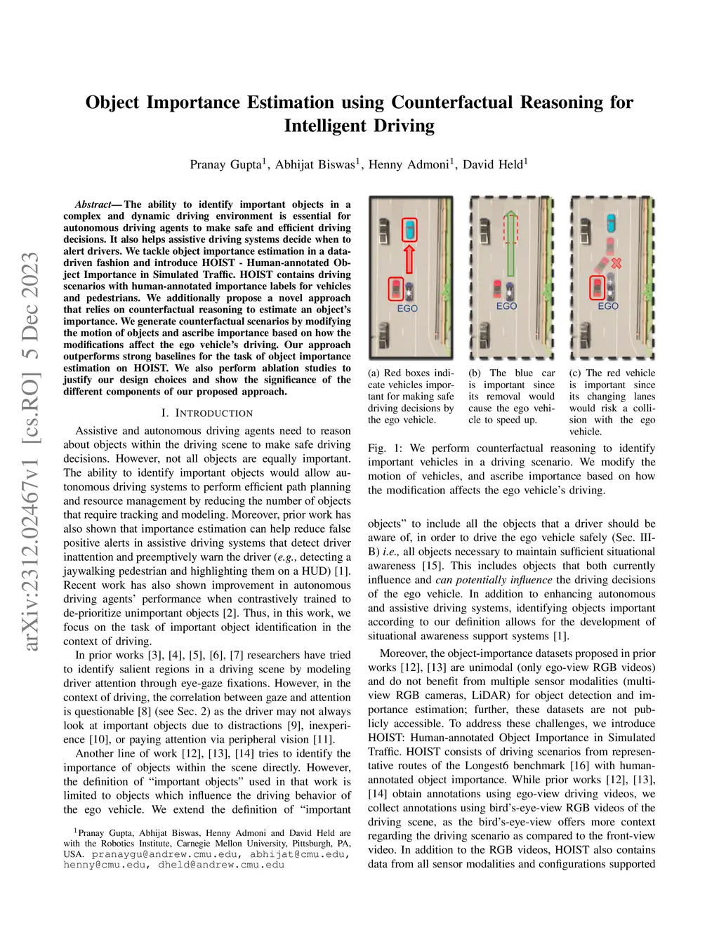 The ability to identify important objects in a complex and dynamic driving environment is essential for autonomous driving agents to make safe and efficient driving decisions. It also helps assistive driving systems decide when to alert drivers. We tackle object importance estimation in a data-driven fashion and introduce HOIST - Human-annotated Object Importance in Simulated Traffic. HOIST contains driving scenarios with human-annotated importance labels for vehicles and pedestrians. We additionally propose a novel approach that relies on counterfactual reasoning to estimate an object's importance. We generate counterfactual scenarios by modifying the motion of objects and ascribe importance based on how the modifications affect the ego vehicle's driving. Our approach outperforms strong baselines for the task of object importance estimation on HOIST. We also perform ablation studies to justify our design choices and show the significance of the different components of our proposed approach.