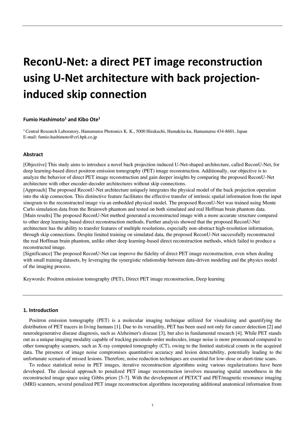 ReconU-Net: a direct PET image reconstruction using U-Net architecture