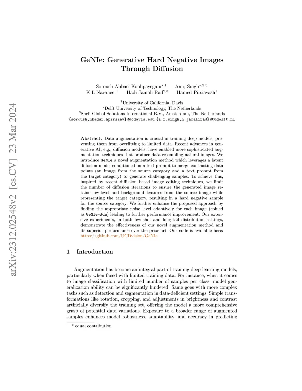 Data augmentation is crucial in training deep models, preventing them from overfitting to limited data. Recent advances in generative AI, e.g., diffusion models, have enabled more sophisticated augmentation techniques that produce data resembling natural images. We introduce GeNIe a novel augmentation method which leverages a latent diffusion model conditioned on a text prompt to merge contrasting data points (an image from the source category and a text prompt from the target category) to generate challenging samples. To achieve this, inspired by recent diffusion based image editing techniques, we limit the number of diffusion iterations to ensure the generated image retains low-level and background features from the source image while representing the target category, resulting in a hard negative sample for the source category. We further enhance the proposed approach by finding the appropriate noise level adaptively for each image (coined as GeNIe-Ada) leading to further performance improvement. Our extensive experiments, in both few-shot and long-tail distribution settings, demonstrate the effectiveness of our novel augmentation method and its superior performance over the prior art. Our code is available here: https://github.com/UCDvision/GeNIe