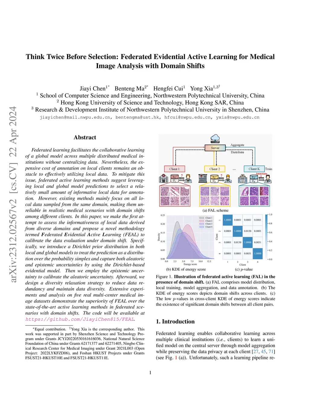Federated learning facilitates the collaborative learning of a global model across multiple distributed medical institutions without centralizing data. Nevertheless, the expensive cost of annotation on local clients remains an obstacle to effectively utilizing local data. To mitigate this issue, federated active learning methods suggest leveraging local and global model predictions to select a relatively small amount of informative local data for annotation. However, existing methods mainly focus on all local data sampled from the same domain, making them unreliable in realistic medical scenarios with domain shifts among different clients. In this paper, we make the first attempt to assess the informativeness of local data derived from diverse domains and propose a novel methodology termed Federated Evidential Active Learning (FEAL) to calibrate the data evaluation under domain shift. Specifically, we introduce a Dirichlet prior distribution in both local and global models to treat the prediction as a distribution over the probability simplex and capture both aleatoric and epistemic uncertainties by using the Dirichlet-based evidential model. Then we employ the epistemic uncertainty to calibrate the aleatoric uncertainty. Afterward, we design a diversity relaxation strategy to reduce data redundancy and maintain data diversity. Extensive experiments and analysis on five real multi-center medical image datasets demonstrate the superiority of FEAL over the state-of-the-art active learning methods in federated scenarios with domain shifts. The code will be available at https://github.com/JiayiChen815/FEAL.
