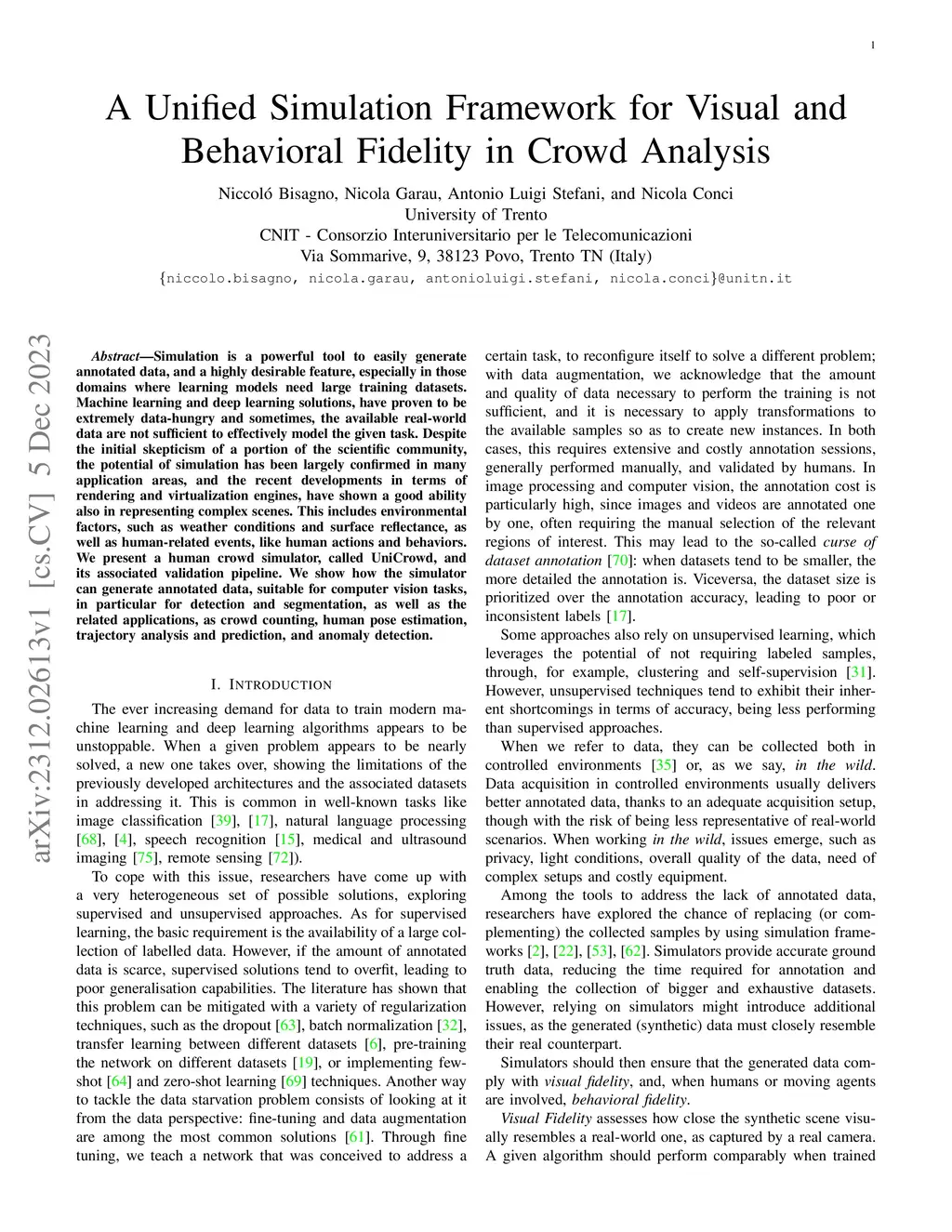 Simulation is a powerful tool to easily generate annotated data, and a highly desirable feature, especially in those domains where learning models need large training datasets. Machine learning and deep learning solutions, have proven to be extremely data-hungry and sometimes, the available real-world data are not sufficient to effectively model the given task. Despite the initial skepticism of a portion of the scientific community, the potential of simulation has been largely confirmed in many application areas, and the recent developments in terms of rendering and virtualization engines, have shown a good ability also in representing complex scenes. This includes environmental factors, such as weather conditions and surface reflectance, as well as human-related events, like human actions and behaviors. We present a human crowd simulator, called UniCrowd, and its associated validation pipeline. We show how the simulator can generate annotated data, suitable for computer vision tasks, in particular for detection and segmentation, as well as the related applications, as crowd counting, human pose estimation, trajectory analysis and prediction, and anomaly detection.
