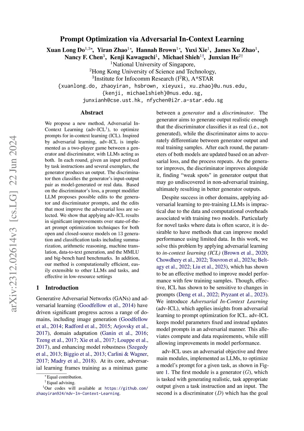 We propose a new method, Adversarial In-Context Learning (adv-ICL), to optimize prompt for in-context learning (ICL) by employing one LLM as a generator, another as a discriminator, and a third as a prompt modifier. As in traditional adversarial learning, adv-ICL is implemented as a two-player game between the generator and discriminator, where the generator tries to generate realistic enough output to fool the discriminator. In each round, given an input prefixed by task instructions and several exemplars, the generator produces an output. The discriminator is then tasked with classifying the generator input-output pair as model-generated or real data. Based on the discriminator loss, the prompt modifier proposes possible edits to the generator and discriminator prompts, and the edits that most improve the adversarial loss are selected. We show that adv-ICL results in significant improvements over state-of-the-art prompt optimization techniques for both open and closed-source models on 11 generation and classification tasks including summarization, arithmetic reasoning, machine translation, data-to-text generation, and the MMLU and big-bench hard benchmarks. In addition, because our method uses pre-trained models and updates only prompts rather than model parameters, it is computationally efficient, easy to extend to any LLM and task, and effective in low-resource settings.