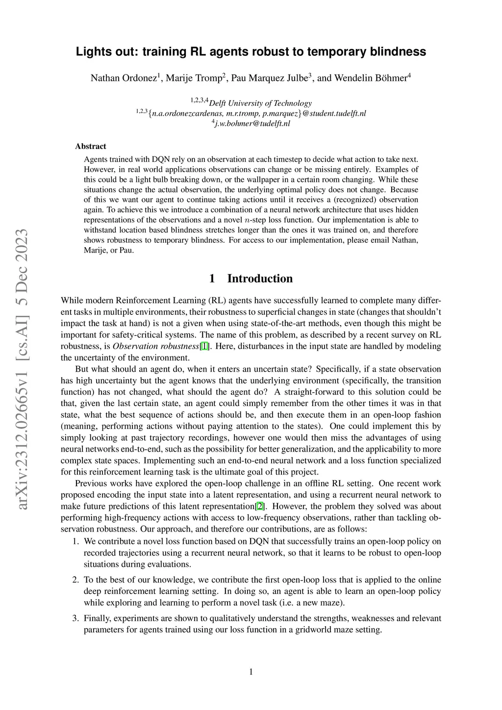 Agents trained with DQN rely on an observation at each timestep to decide what action to take next. However, in real world applications observations can change or be missing entirely. Examples of this could be a light bulb breaking down, or the wallpaper in a certain room changing. While these situations change the actual observation, the underlying optimal policy does not change. Because of this we want our agent to continue taking actions until it receives a (recognized) observation again. To achieve this we introduce a combination of a neural network architecture that uses hidden representations of the observations and a novel n-step loss function. Our implementation is able to withstand location based blindness stretches longer than the ones it was trained on, and therefore shows robustness to temporary blindness. For access to our implementation, please email Nathan, Marije, or Pau.