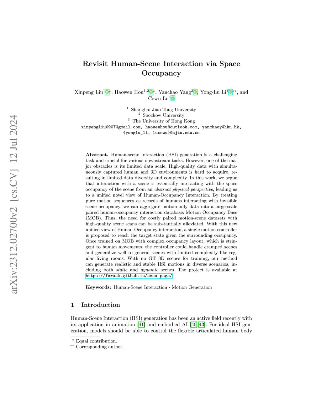 Human-scene Interaction (HSI) generation is a challenging task and crucial for various downstream tasks. However, one of the major obstacles is its limited data scale. High-quality data with simultaneously captured human and 3D environments is hard to acquire, resulting in limited data diversity and complexity. In this work, we argue that interaction with a scene is essentially interacting with the space occupancy of the scene from an abstract physical perspective, leading us to a unified novel view of Human-Occupancy Interaction. By treating pure motion sequences as records of humans interacting with invisible scene occupancy, we can aggregate motion-only data into a large-scale paired human-occupancy interaction database: Motion Occupancy Base (MOB). Thus, the need for costly paired motion-scene datasets with high-quality scene scans can be substantially alleviated. With this new unified view of Human-Occupancy interaction, a single motion controller is proposed to reach the target state given the surrounding occupancy. Once trained on MOB with complex occupancy layout, which is stringent to human movements, the controller could handle cramped scenes and generalize well to general scenes with limited complexity like regular living rooms. With no GT 3D scenes for training, our method can generate realistic and stable HSI motions in diverse scenarios, including both static and dynamic scenes. The project is available at https://foruck.github.io/occu-page/.