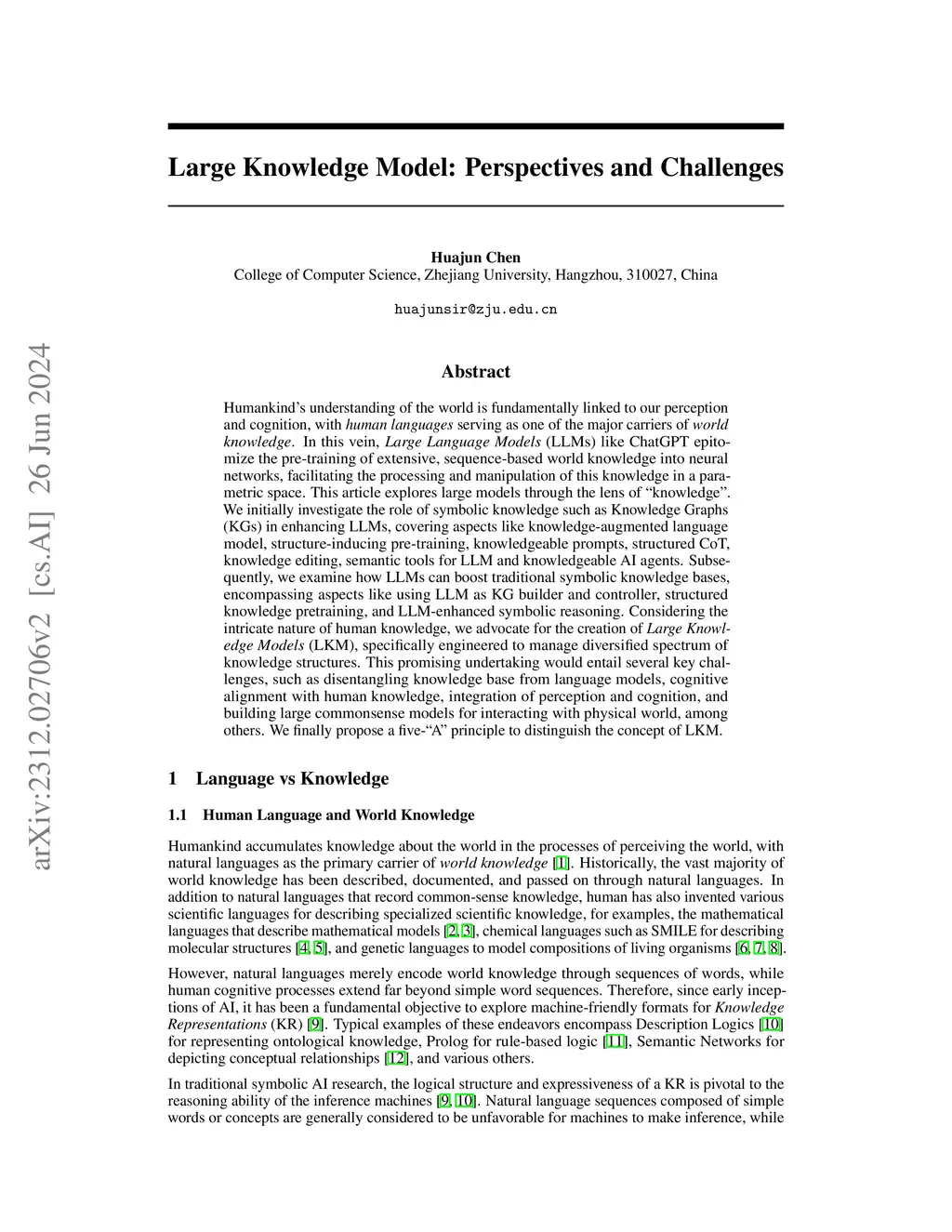 Humankind's understanding of the world is fundamentally linked to our perception and cognition, with \emph{human languages} serving as one of the major carriers of \emph{world knowledge}. In this vein, \emph{Large Language Models} (LLMs) like ChatGPT epitomize the pre-training of extensive, sequence-based world knowledge into neural networks, facilitating the processing and manipulation of this knowledge in a parametric space. This article explores large models through the lens of "knowledge". We initially investigate the role of symbolic knowledge such as Knowledge Graphs (KGs) in enhancing LLMs, covering aspects like knowledge-augmented language model, structure-inducing pre-training, knowledgeable prompts, structured CoT, knowledge editing, semantic tools for LLM and knowledgeable AI agents. Subsequently, we examine how LLMs can boost traditional symbolic knowledge bases, encompassing aspects like using LLM as KG builder and controller, structured knowledge pretraining, and LLM-enhanced symbolic reasoning. Considering the intricate nature of human knowledge, we advocate for the creation of \emph{Large Knowledge Models} (LKM), specifically engineered to manage diversified spectrum of knowledge structures. This promising undertaking would entail several key challenges, such as disentangling knowledge base from language models, cognitive alignment with human knowledge, integration of perception and cognition, and building large commonsense models for interacting with physical world, among others. We finally propose a five-"A" principle to distinguish the concept of LKM.