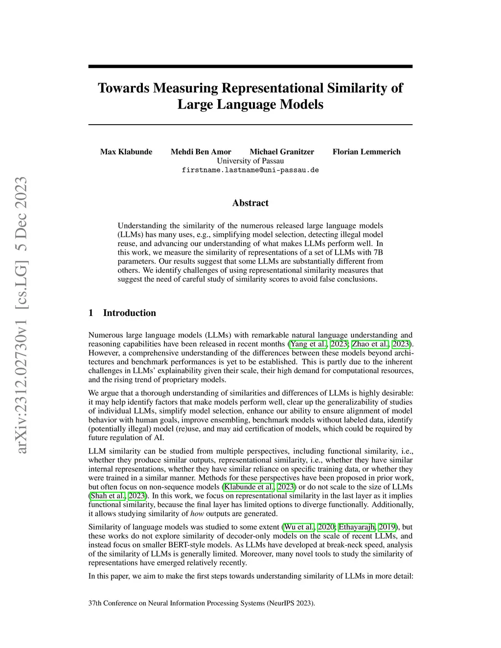 Understanding the similarity of the numerous released large language models (LLMs) has many uses, e.g., simplifying model selection, detecting illegal model reuse, and advancing our understanding of what makes LLMs perform well. In this work, we measure the similarity of representations of a set of LLMs with 7B parameters. Our results suggest that some LLMs are substantially different from others. We identify challenges of using representational similarity measures that suggest the need of careful study of similarity scores to avoid false conclusions.
