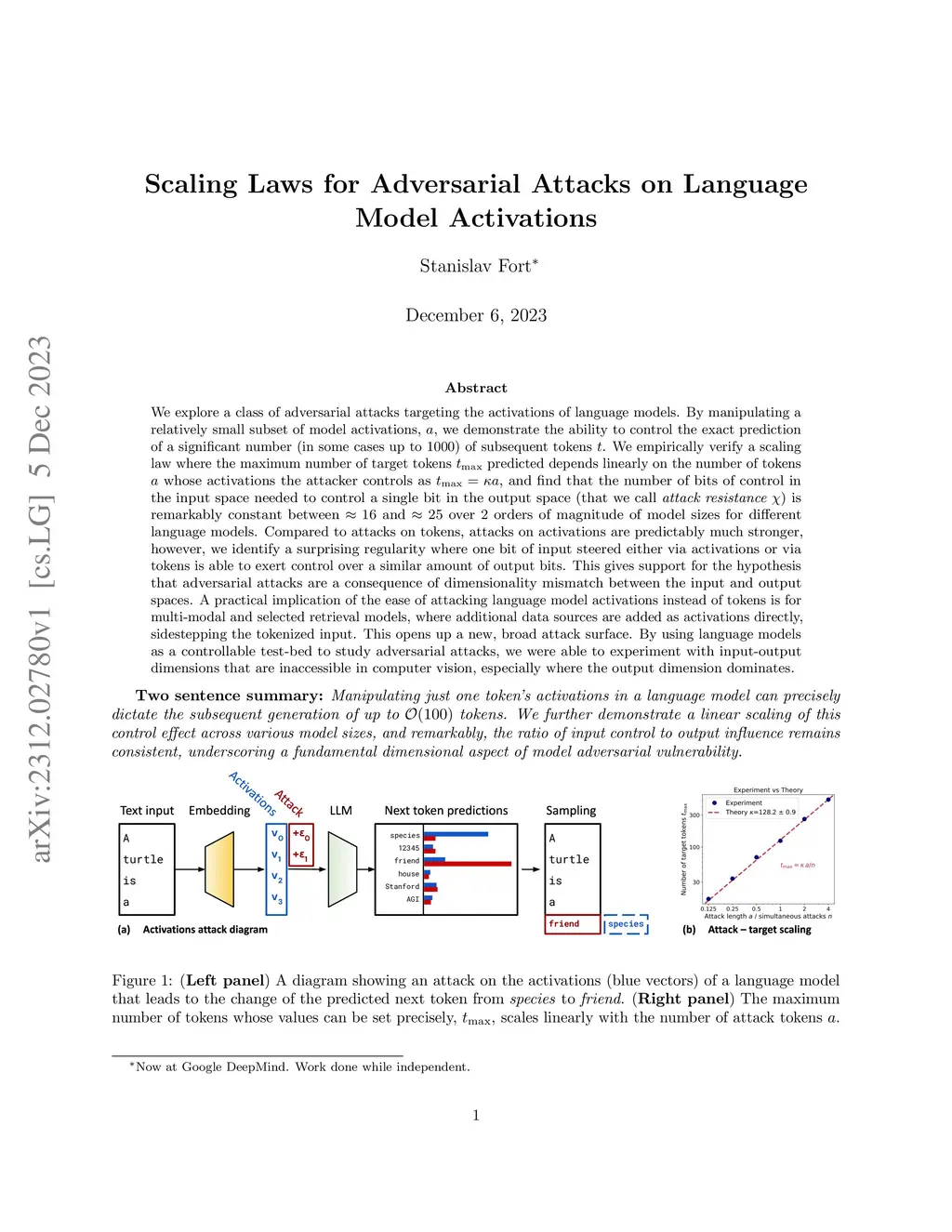 We explore a class of adversarial attacks targeting the activations of language models. By manipulating a relatively small subset of model activations, , we demonstrate the ability to control the exact prediction of a significant number (in some cases up to 1000) of subsequent tokens . We empirically verify a scaling law where the maximum number of target tokens predicted depends linearly on the number of tokens whose activations the attacker controls as . We find that the number of bits of control in the input space needed to control a single bit in the output space (what we call attack resistance ) is remarkably constant between and over 2 orders of magnitude of model sizes for different language models. Compared to attacks on tokens, attacks on activations are predictably much stronger, however, we identify a surprising regularity where one bit of input steered either via activations or via tokens is able to exert control over a similar amount of output bits. This gives support for the hypothesis that adversarial attacks are a consequence of dimensionality mismatch between the input and output spaces. A practical implication of the ease of attacking language model activations instead of tokens is for multi-modal and selected retrieval models, where additional data sources are added as activations directly, sidestepping the tokenized input. This opens up a new, broad attack surface. By using language models as a controllable test-bed to study adversarial attacks, we were able to experiment with input-output dimensions that are inaccessible in computer vision, especially where the output dimension dominates.
