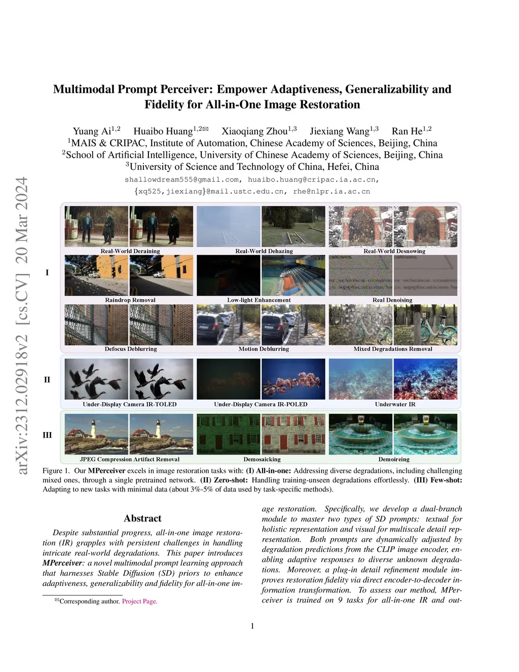 Despite substantial progress, all-in-one image restoration (IR) grapples with persistent challenges in handling intricate real-world degradations. This paper introduces MPerceiver: a novel multimodal prompt learning approach that harnesses Stable Diffusion (SD) priors to enhance adaptiveness, generalizability and fidelity for all-in-one image restoration. Specifically, we develop a dual-branch module to master two types of SD prompts: textual for holistic representation and visual for multiscale detail representation. Both prompts are dynamically adjusted by degradation predictions from the CLIP image encoder, enabling adaptive responses to diverse unknown degradations. Moreover, a plug-in detail refinement module improves restoration fidelity via direct encoder-to-decoder information transformation. To assess our method, MPerceiver is trained on 9 tasks for all-in-one IR and outperforms state-of-the-art task-specific methods across most tasks. Post multitask pre-training, MPerceiver attains a generalized representation in low-level vision, exhibiting remarkable zero-shot and few-shot capabilities in unseen tasks. Extensive experiments on 16 IR tasks underscore the superiority of MPerceiver in terms of adaptiveness, generalizability and fidelity.