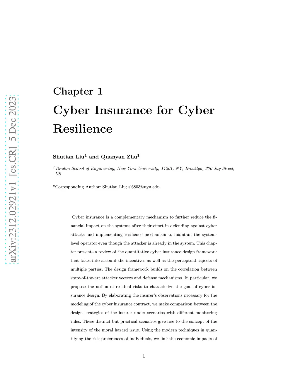 Cyber insurance is a complementary mechanism to further reduce the financial impact on the systems after their effort in defending against cyber attacks and implementing resilience mechanism to maintain the system-level operator even though the attacker is already in the system. This chapter presents a review of the quantitative cyber insurance design framework that takes into account the incentives as well as the perceptual aspects of multiple parties. The design framework builds on the correlation between state-of-the-art attacker vectors and defense mechanisms. In particular, we propose the notion of residual risks to characterize the goal of cyber insurance design. By elaborating the insurer's observations necessary for the modeling of the cyber insurance contract, we make comparison between the design strategies of the insurer under scenarios with different monitoring rules. These distinct but practical scenarios give rise to the concept of the intensity of the moral hazard issue. Using the modern techniques in quantifying the risk preferences of individuals, we link the economic impacts of perception manipulation with moral hazard. With the joint design of cyber insurance design and risk perceptions, cyber resilience can be enhanced under mild assumptions on the monitoring of insurees' actions. Finally, we discuss possible extensions on the cyber insurance design framework to more sophisticated settings and the regulations to strengthen the cyber insurance markets.