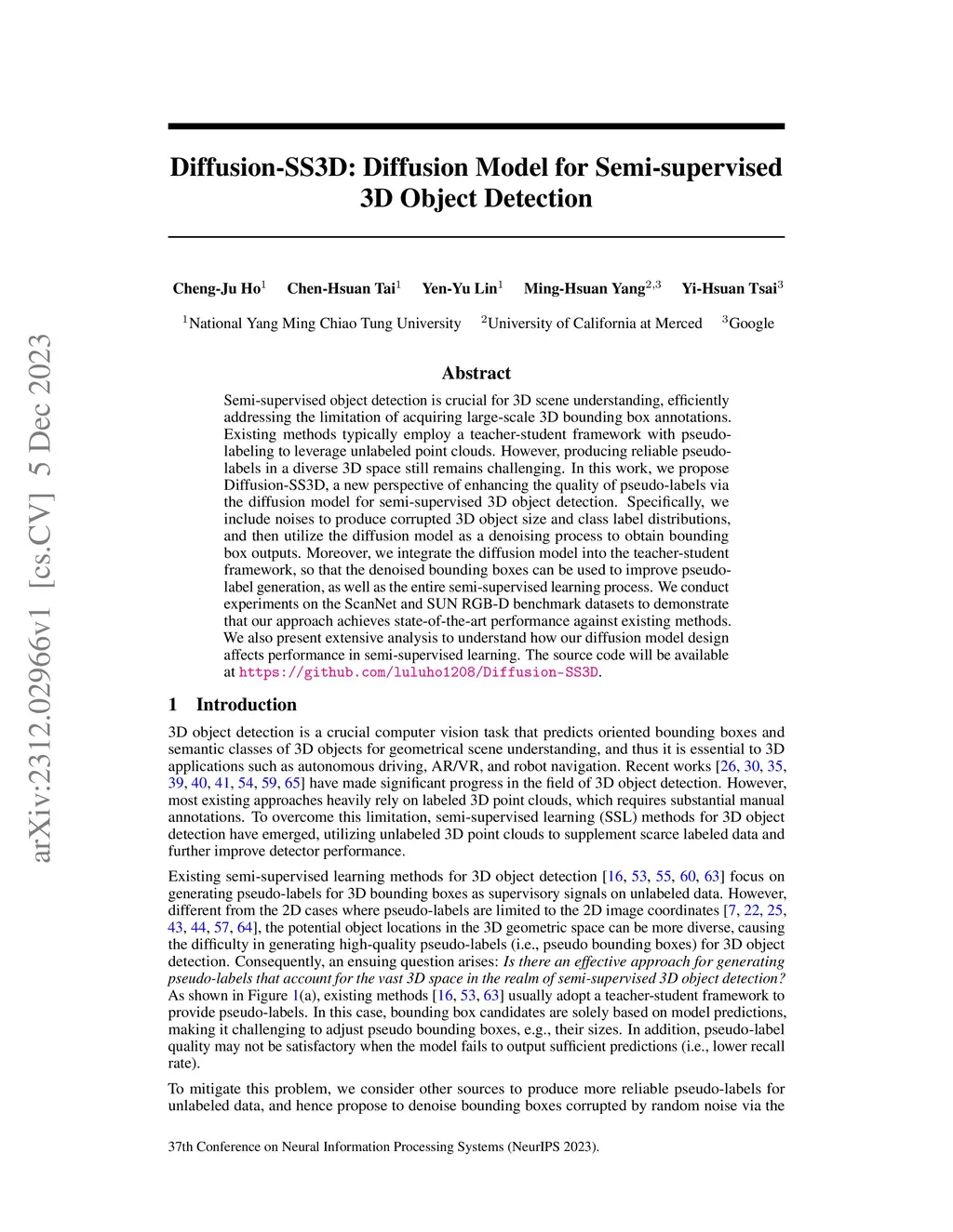 Diffusion-SS3D: Diffusion Model for Semi-supervised 3D Object Detection