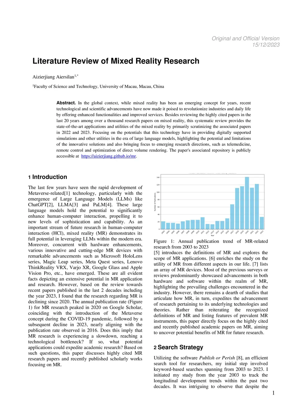 In the global context, while mixed reality has been an emerging concept for years, recent technological and scientific advancements have now made it poised to revolutionize industries and daily life by offering enhanced functionalities and improved services. Besides reviewing the highly cited papers in the last 20 years among over a thousand research papers on mixed reality, this systematic review provides the state-of-the-art applications and utilities of the mixed reality by primarily scrutinizing the associated papers in 2022 and 2023. Focusing on the potentials that this technology have in providing digitally supported simulations and other utilities in the era of large language models, highlighting the potential and limitations of the innovative solutions and also bringing focus to emerging research directions, such as telemedicine, remote control and optimization of direct volume rendering. The paper's associated repository is publicly accessible at https://aizierjiang.github.io/mr.