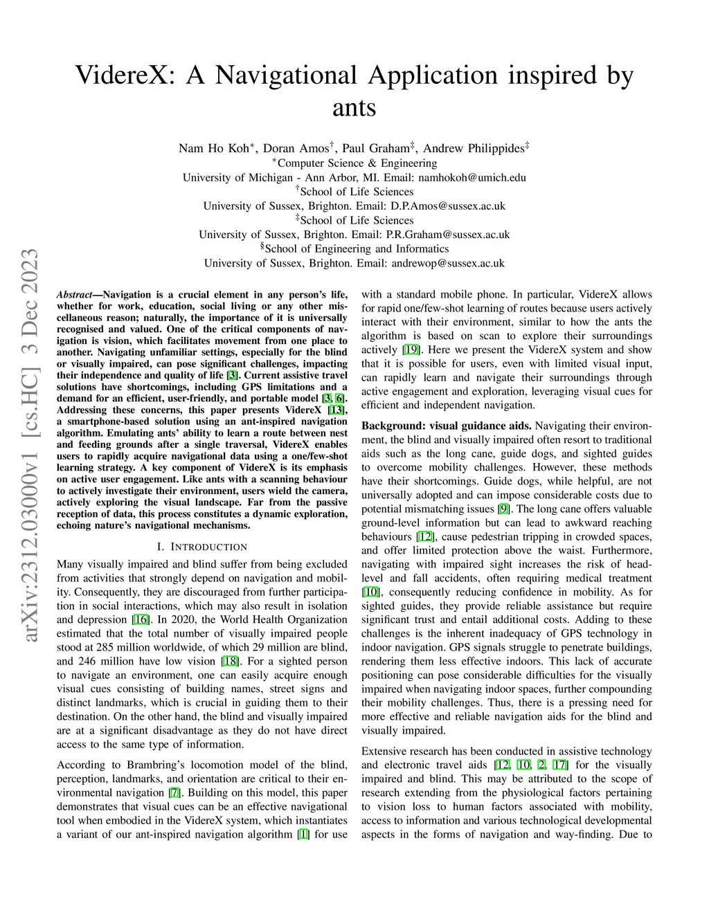 Navigation is a crucial element in any person's life, whether for work, education, social living or any other miscellaneous reason; naturally, the importance of it is universally recognised and valued. One of the critical components of navigation is vision, which facilitates movement from one place to another. Navigating unfamiliar settings, especially for the blind or visually impaired, can pose significant challenges, impacting their independence and quality of life. Current assistive travel solutions have shortcomings, including GPS limitations and a demand for an efficient, user-friendly, and portable model. Addressing these concerns, this paper presents VidereX: a smartphone-based solution using an ant-inspired navigation algorithm. Emulating ants' ability to learn a route between nest and feeding grounds after a single traversal, VidereX enables users to rapidly acquire navigational data using a one/few-shot learning strategy. A key component of VidereX is its emphasis on active user engagement. Like ants with a scanning behaviour to actively investigate their environment, users wield the camera, actively exploring the visual landscape. Far from the passive reception of data, this process constitutes a dynamic exploration, echoing nature's navigational mechanisms.