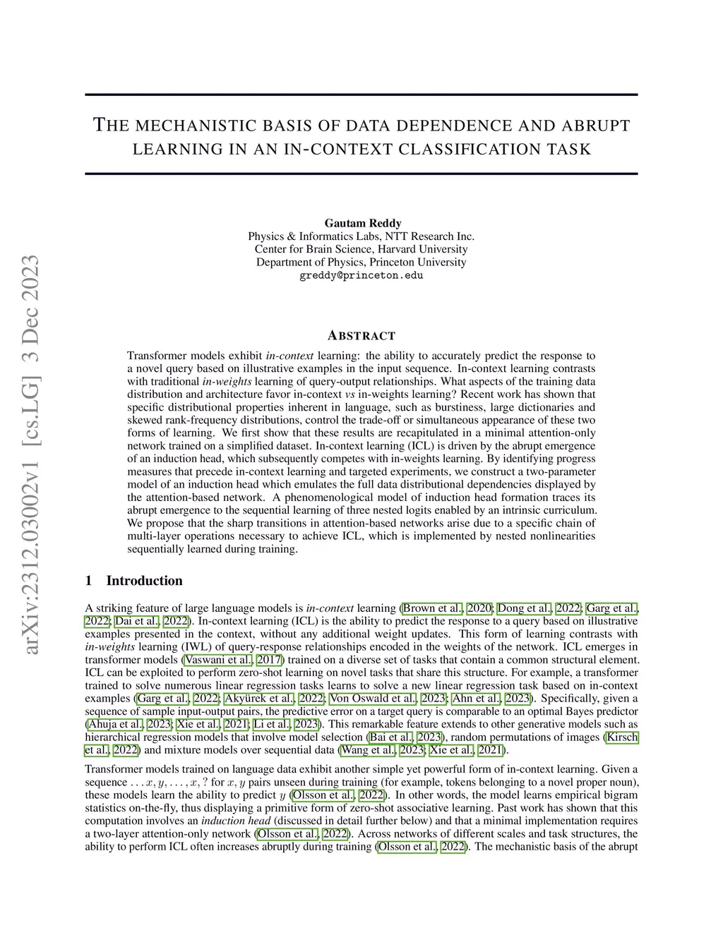 Transformer models exhibit in-context learning: the ability to accurately predict the response to a novel query based on illustrative examples in the input sequence. In-context learning contrasts with traditional in-weights learning of query-output relationships. What aspects of the training data distribution and architecture favor in-context vs in-weights learning? Recent work has shown that specific distributional properties inherent in language, such as burstiness, large dictionaries and skewed rank-frequency distributions, control the trade-off or simultaneous appearance of these two forms of learning. We first show that these results are recapitulated in a minimal attention-only network trained on a simplified dataset. In-context learning (ICL) is driven by the abrupt emergence of an induction head, which subsequently competes with in-weights learning. By identifying progress measures that precede in-context learning and targeted experiments, we construct a two-parameter model of an induction head which emulates the full data distributional dependencies displayed by the attention-based network. A phenomenological model of induction head formation traces its abrupt emergence to the sequential learning of three nested logits enabled by an intrinsic curriculum. We propose that the sharp transitions in attention-based networks arise due to a specific chain of multi-layer operations necessary to achieve ICL, which is implemented by nested nonlinearities sequentially learned during training.