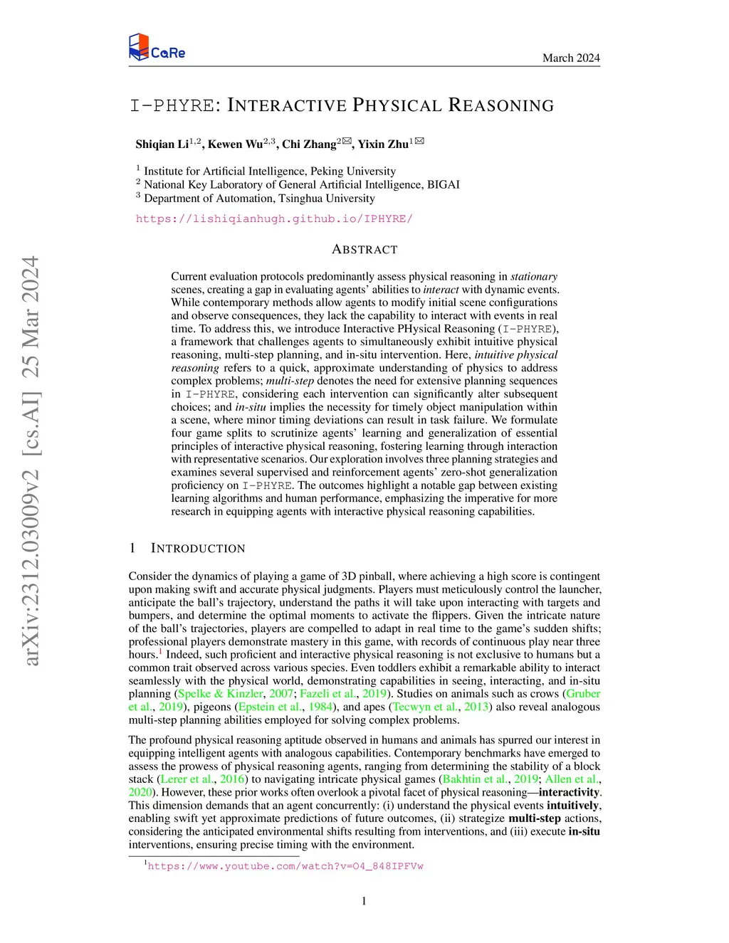 Current evaluation protocols predominantly assess physical reasoning in stationary scenes, creating a gap in evaluating agents' abilities to interact with dynamic events. While contemporary methods allow agents to modify initial scene configurations and observe consequences, they lack the capability to interact with events in real time. To address this, we introduce I-PHYRE, a framework that challenges agents to simultaneously exhibit intuitive physical reasoning, multi-step planning, and in-situ intervention. Here, intuitive physical reasoning refers to a quick, approximate understanding of physics to address complex problems; multi-step denotes the need for extensive sequence planning in I-PHYRE, considering each intervention can significantly alter subsequent choices; and in-situ implies the necessity for timely object manipulation within a scene, where minor timing deviations can result in task failure. We formulate four game splits to scrutinize agents' learning and generalization of essential principles of interactive physical reasoning, fostering learning through interaction with representative scenarios. Our exploration involves three planning strategies and examines several supervised and reinforcement agents' zero-shot generalization proficiency on I-PHYRE. The outcomes highlight a notable gap between existing learning algorithms and human performance, emphasizing the imperative for more research in enhancing agents with interactive physical reasoning capabilities. The environment and baselines will be made publicly available.