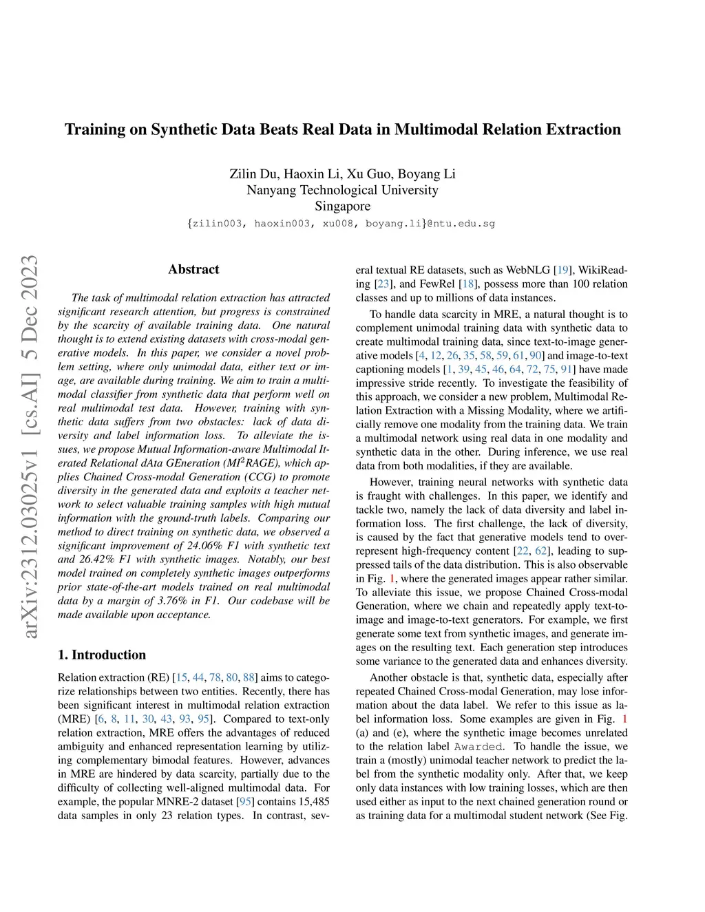 The task of multimodal relation extraction has attracted significant research attention, but progress is constrained by the scarcity of available training data. One natural thought is to extend existing datasets with cross-modal generative models. In this paper, we consider a novel problem setting, where only unimodal data, either text or image, are available during training. We aim to train a multimodal classifier from synthetic data that perform well on real multimodal test data. However, training with synthetic data suffers from two obstacles: lack of data diversity and label information loss. To alleviate the issues, we propose Mutual Information-aware Multimodal Iterated Relational dAta GEneration (MI2RAGE), which applies Chained Cross-modal Generation (CCG) to promote diversity in the generated data and exploits a teacher network to select valuable training samples with high mutual information with the ground-truth labels. Comparing our method to direct training on synthetic data, we observed a significant improvement of 24.06% F1 with synthetic text and 26.42% F1 with synthetic images. Notably, our best model trained on completely synthetic images outperforms prior state-of-the-art models trained on real multimodal data by a margin of 3.76% in F1. Our codebase will be made available upon acceptance.