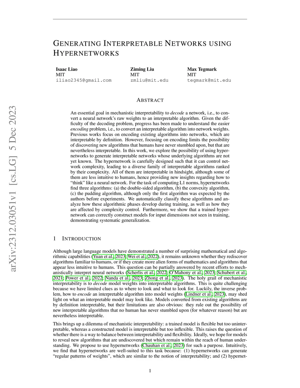 An essential goal in mechanistic interpretability to decode a network, i.e., to convert a neural network's raw weights to an interpretable algorithm. Given the difficulty of the decoding problem, progress has been made to understand the easier encoding problem, i.e., to convert an interpretable algorithm into network weights. Previous works focus on encoding existing algorithms into networks, which are interpretable by definition. However, focusing on encoding limits the possibility of discovering new algorithms that humans have never stumbled upon, but that are nevertheless interpretable. In this work, we explore the possibility of using hypernetworks to generate interpretable networks whose underlying algorithms are not yet known. The hypernetwork is carefully designed such that it can control network complexity, leading to a diverse family of interpretable algorithms ranked by their complexity. All of them are interpretable in hindsight, although some of them are less intuitive to humans, hence providing new insights regarding how to "think" like a neural network. For the task of computing L1 norms, hypernetworks find three algorithms: (a) the double-sided algorithm, (b) the convexity algorithm, (c) the pudding algorithm, although only the first algorithm was expected by the authors before experiments. We automatically classify these algorithms and analyze how these algorithmic phases develop during training, as well as how they are affected by complexity control. Furthermore, we show that a trained hypernetwork can correctly construct models for input dimensions not seen in training, demonstrating systematic generalization.