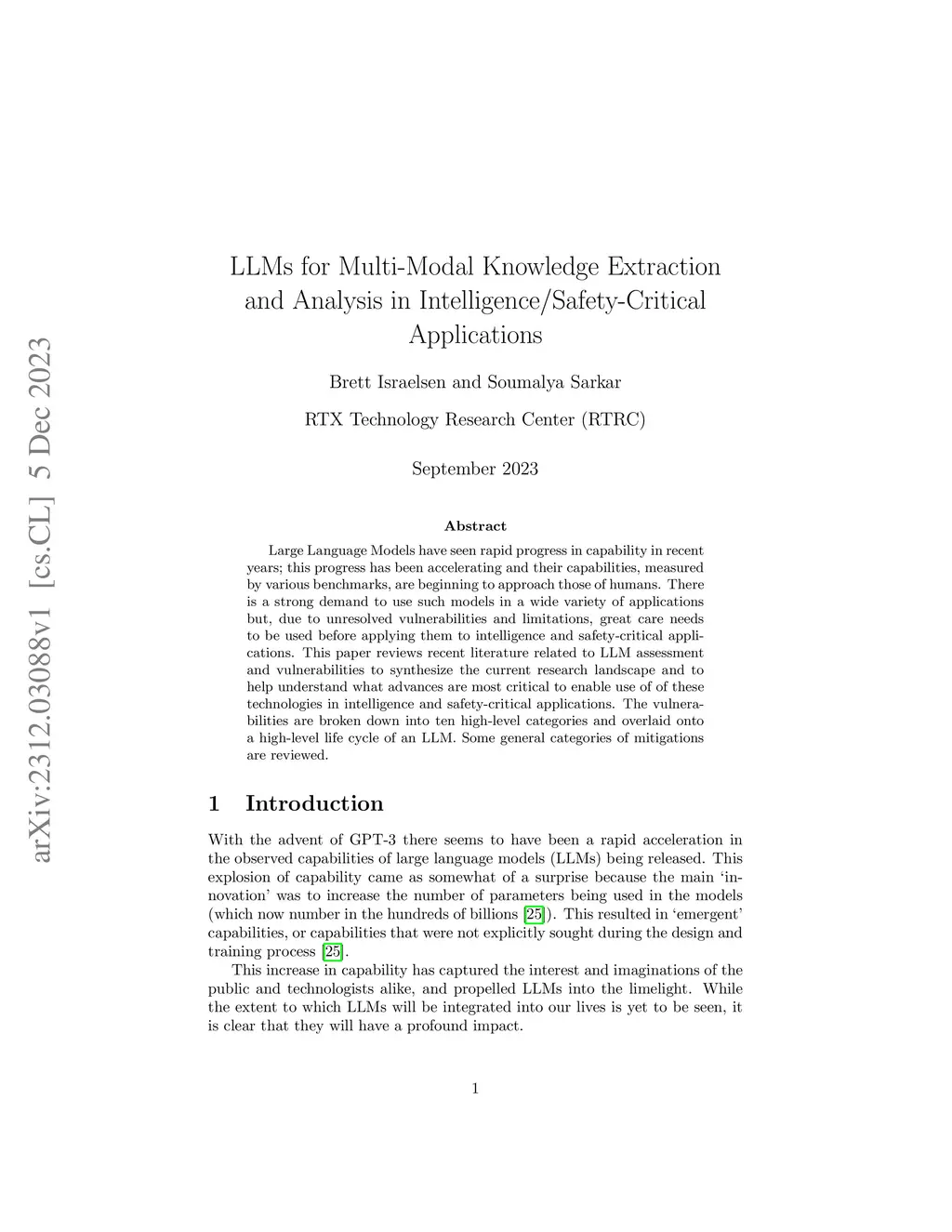 Large Language Models have seen rapid progress in capability in recent years; this progress has been accelerating and their capabilities, measured by various benchmarks, are beginning to approach those of humans. There is a strong demand to use such models in a wide variety of applications but, due to unresolved vulnerabilities and limitations, great care needs to be used before applying them to intelligence and safety-critical applications. This paper reviews recent literature related to LLM assessment and vulnerabilities to synthesize the current research landscape and to help understand what advances are most critical to enable use of of these technologies in intelligence and safety-critical applications. The vulnerabilities are broken down into ten high-level categories and overlaid onto a high-level life cycle of an LLM. Some general categories of mitigations are reviewed.