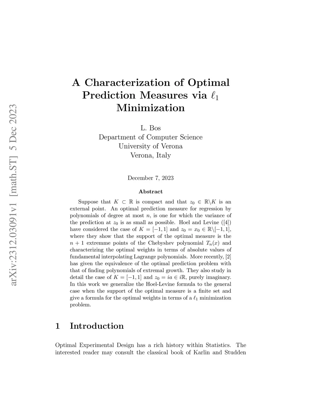 Suppose that is compact and that is an external point. An optimal prediction measure for regression by polynomials of degree at most is one for which the variance of the prediction at is as small as possible. Hoel and Levine (\cite{HL}) have considered the case of and where they show that the support of the optimal measure is the extremme points of the Chebyshev polynomial and characterizing the optimal weights in terms of absolute values of fundamental interpolating Lagrange polynomials. More recently, \cite{BLO} has given the equivalence of the optimal prediction problem with that of finding polynomials of extremal growth. They also study in detail the case of and purely imaginary. In this work we generalize the Hoel-Levine formula to the general case when the support of the optimal measure is a finite set and give a formula for the optimal weights in terms of a minimization problem.
