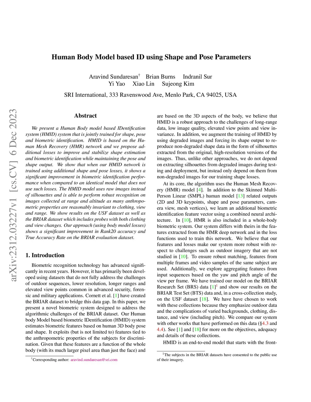We present a Human Body model based IDentification system (HMID) system that is jointly trained for shape, pose and biometric identification. HMID is based on the Human Mesh Recovery (HMR) network and we propose additional losses to improve and stabilize shape estimation and biometric identification while maintaining the pose and shape output. We show that when our HMID network is trained using additional shape and pose losses, it shows a significant improvement in biometric identification performance when compared to an identical model that does not use such losses. The HMID model uses raw images instead of silhouettes and is able to perform robust recognition on images collected at range and altitude as many anthropometric properties are reasonably invariant to clothing, view and range. We show results on the USF dataset as well as the BRIAR dataset which includes probes with both clothing and view changes. Our approach (using body model losses) shows a significant improvement in Rank20 accuracy and True Accuracy Rate on the BRIAR evaluation dataset.