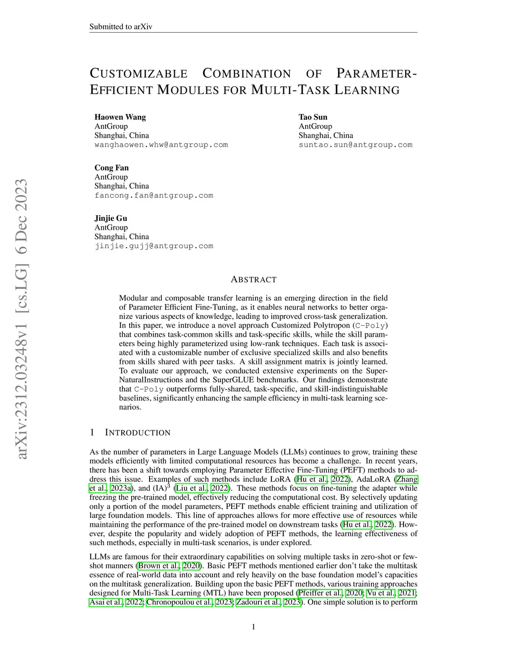Modular and composable transfer learning is an emerging direction in the field of Parameter Efficient Fine-Tuning, as it enables neural networks to better organize various aspects of knowledge, leading to improved cross-task generalization. In this paper, we introduce a novel approach Customized Polytropon C-Poly that combines task-common skills and task-specific skills, while the skill parameters being highly parameterized using low-rank techniques. Each task is associated with a customizable number of exclusive specialized skills and also benefits from skills shared with peer tasks. A skill assignment matrix is jointly learned. To evaluate our approach, we conducted extensive experiments on the Super-NaturalInstructions and the SuperGLUE benchmarks. Our findings demonstrate that C-Poly outperforms fully-shared, task-specific, and skill-indistinguishable baselines, significantly enhancing the sample efficiency in multi-task learning scenarios.
