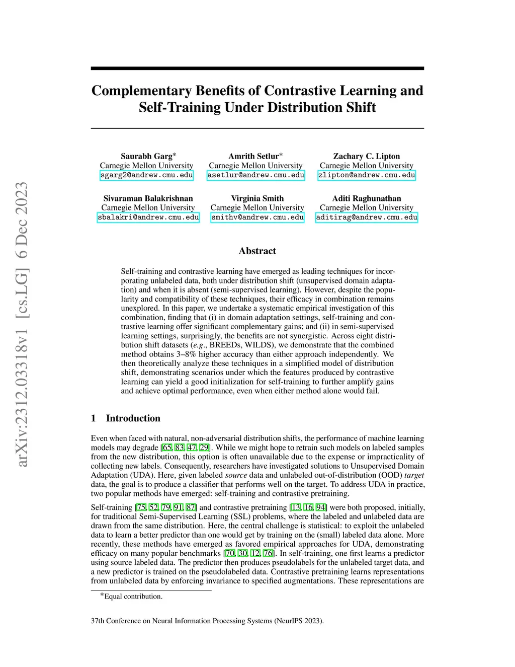 Self-training and contrastive learning have emerged as leading techniques for incorporating unlabeled data, both under distribution shift (unsupervised domain adaptation) and when it is absent (semi-supervised learning). However, despite the popularity and compatibility of these techniques, their efficacy in combination remains unexplored. In this paper, we undertake a systematic empirical investigation of this combination, finding that (i) in domain adaptation settings, self-training and contrastive learning offer significant complementary gains; and (ii) in semi-supervised learning settings, surprisingly, the benefits are not synergistic. Across eight distribution shift datasets (e.g., BREEDs, WILDS), we demonstrate that the combined method obtains 3--8% higher accuracy than either approach independently. We then theoretically analyze these techniques in a simplified model of distribution shift, demonstrating scenarios under which the features produced by contrastive learning can yield a good initialization for self-training to further amplify gains and achieve optimal performance, even when either method alone would fail.