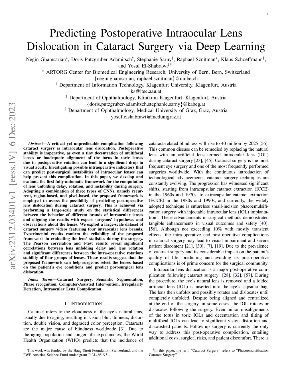A critical yet unpredictable complication following cataract surgery is intraocular lens dislocation. Postoperative stability is imperative, as even a tiny decentration of multifocal lenses or inadequate alignment of the torus in toric lenses due to postoperative rotation can lead to a significant drop in visual acuity. Investigating possible intraoperative indicators that can predict post-surgical instabilities of intraocular lenses can help prevent this complication. In this paper, we develop and evaluate the first fully-automatic framework for the computation of lens unfolding delay, rotation, and instability during surgery. Adopting a combination of three types of CNNs, namely recurrent, region-based, and pixel-based, the proposed framework is employed to assess the possibility of predicting post-operative lens dislocation during cataract surgery. This is achieved via performing a large-scale study on the statistical differences between the behavior of different brands of intraocular lenses and aligning the results with expert surgeons' hypotheses and observations about the lenses. We exploit a large-scale dataset of cataract surgery videos featuring four intraocular lens brands. Experimental results confirm the reliability of the proposed framework in evaluating the lens' statistics during the surgery. The Pearson correlation and t-test results reveal significant correlations between lens unfolding delay and lens rotation and significant differences between the intra-operative rotations stability of four groups of lenses. These results suggest that the proposed framework can help surgeons select the lenses based on the patient's eye conditions and predict post-surgical lens dislocation.