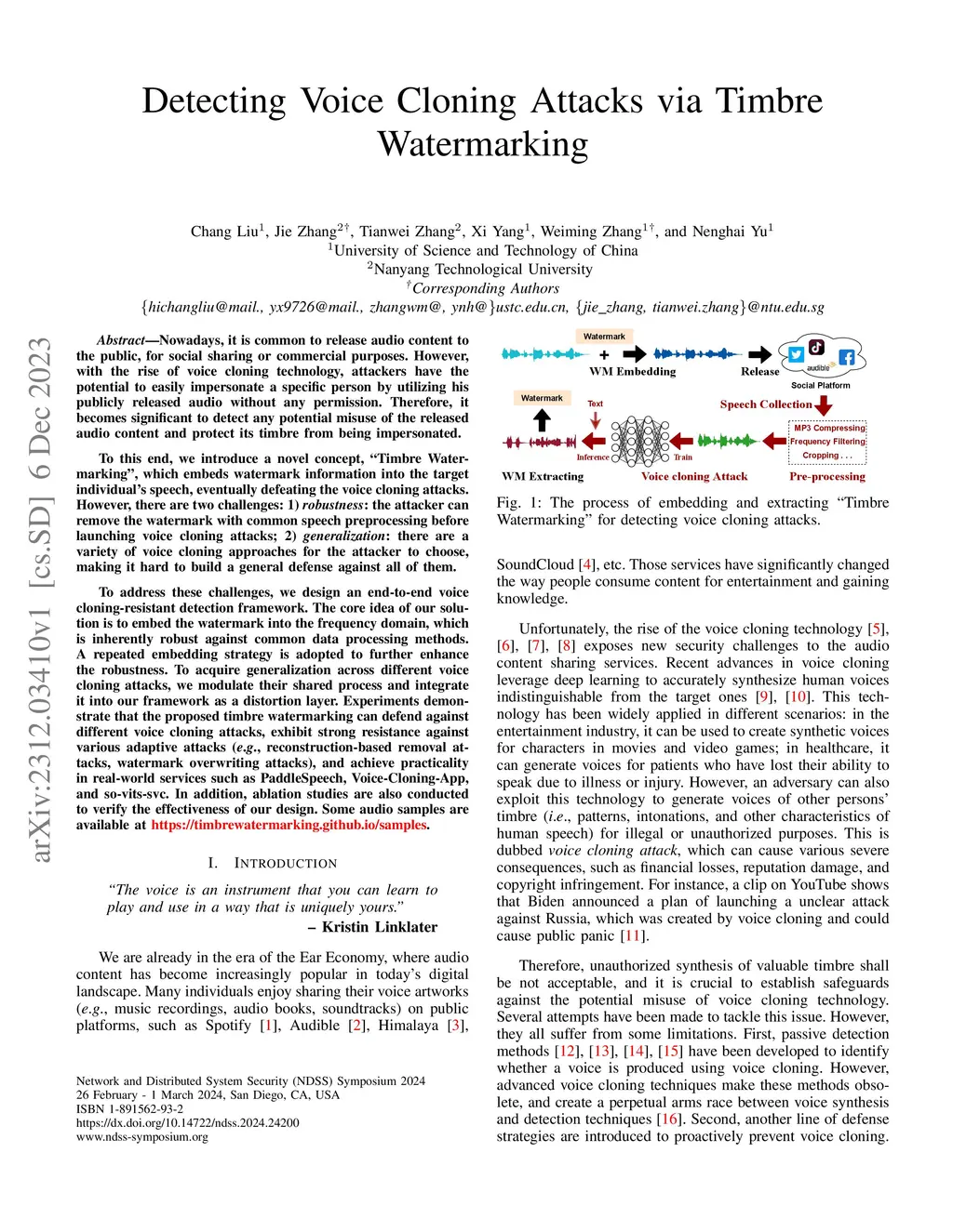 Detecting Voice Cloning Attacks via Timbre Watermarking