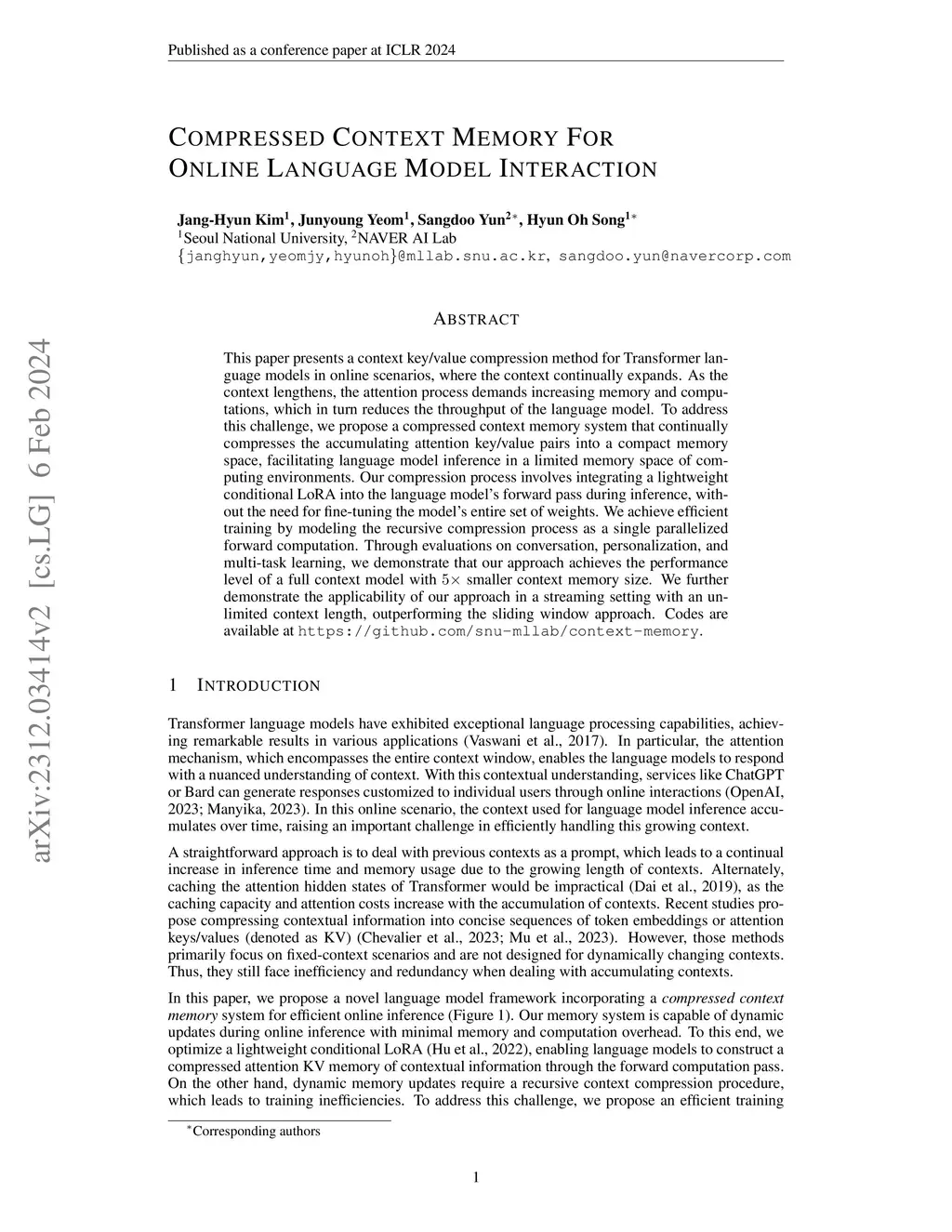 Compressed Context Memory For Online Language Model Interaction