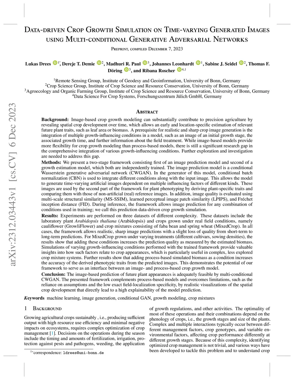 Image-based crop growth modeling can substantially contribute to precision agriculture by revealing spatial crop development over time, which allows an early and location-specific estimation of relevant future plant traits, such as leaf area or biomass. A prerequisite for realistic and sharp crop image generation is the integration of multiple growth-influencing conditions in a model, such as an image of an initial growth stage, the associated growth time, and further information about the field treatment. We present a two-stage framework consisting first of an image prediction model and second of a growth estimation model, which both are independently trained. The image prediction model is a conditional Wasserstein generative adversarial network (CWGAN). In the generator of this model, conditional batch normalization (CBN) is used to integrate different conditions along with the input image. This allows the model to generate time-varying artificial images dependent on multiple influencing factors of different kinds. These images are used by the second part of the framework for plant phenotyping by deriving plant-specific traits and comparing them with those of non-artificial (real) reference images. For various crop datasets, the framework allows realistic, sharp image predictions with a slight loss of quality from short-term to long-term predictions. Simulations of varying growth-influencing conditions performed with the trained framework provide valuable insights into how such factors relate to crop appearances, which is particularly useful in complex, less explored crop mixture systems. Further results show that adding process-based simulated biomass as a condition increases the accuracy of the derived phenotypic traits from the predicted images. This demonstrates the potential of our framework to serve as an interface between an image- and process-based crop growth model.