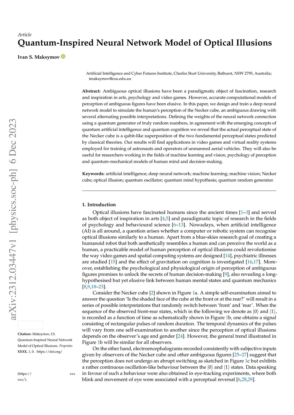 Ambiguous optical illusions have been a paradigmatic object of fascination, research and inspiration in arts, psychology and video games. However, accurate computational models of perception of ambiguous figures have been elusive. In this paper, we design and train a deep neural network model to simulate the human's perception of the Necker cube, an ambiguous drawing with several alternating possible interpretations. Defining the weights of the neural network connection using a quantum generator of truly random numbers, in agreement with the emerging concepts of quantum artificial intelligence and quantum cognition we reveal that the actual perceptual state of the Necker cube is a qubit-like superposition of the two fundamental perceptual states predicted by classical theories. Our results will find applications in video games and virtual reality systems employed for training of astronauts and operators of unmanned aerial vehicles. They will also be useful for researchers working in the fields of machine learning and vision, psychology of perception and quantum-mechanical models of human mind and decision-making.