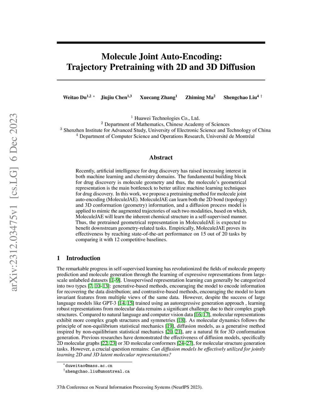 Recently, artificial intelligence for drug discovery has raised increasing interest in both machine learning and chemistry domains. The fundamental building block for drug discovery is molecule geometry and thus, the molecule's geometrical representation is the main bottleneck to better utilize machine learning techniques for drug discovery. In this work, we propose a pretraining method for molecule joint auto-encoding (MoleculeJAE). MoleculeJAE can learn both the 2D bond (topology) and 3D conformation (geometry) information, and a diffusion process model is applied to mimic the augmented trajectories of such two modalities, based on which, MoleculeJAE will learn the inherent chemical structure in a self-supervised manner. Thus, the pretrained geometrical representation in MoleculeJAE is expected to benefit downstream geometry-related tasks. Empirically, MoleculeJAE proves its effectiveness by reaching state-of-the-art performance on 15 out of 20 tasks by comparing it with 12 competitive baselines.