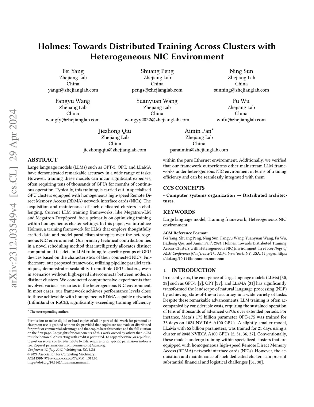 Large language models (LLMs) such as GPT-3, OPT, and LLaMA have demonstrated remarkable accuracy in a wide range of tasks. However, training these models can incur significant expenses, often requiring tens of thousands of GPUs for months of continuous operation. Typically, this training is carried out in specialized GPU clusters equipped with homogeneous high-speed Remote Direct Memory Access (RDMA) network interface cards (NICs). The acquisition and maintenance of such dedicated clusters is challenging. Current LLM training frameworks, like Megatron-LM and Megatron-DeepSpeed, focus primarily on optimizing training within homogeneous cluster settings. In this paper, we introduce Holmes, a training framework for LLMs that employs thoughtfully crafted data and model parallelism strategies over the heterogeneous NIC environment. Our primary technical contribution lies in a novel scheduling method that intelligently allocates distinct computational tasklets in LLM training to specific groups of GPU devices based on the characteristics of their connected NICs. Furthermore, our proposed framework, utilizing pipeline parallel techniques, demonstrates scalability to multiple GPU clusters, even in scenarios without high-speed interconnects between nodes in distinct clusters. We conducted comprehensive experiments that involved various scenarios in the heterogeneous NIC environment. In most cases, our framework achieves performance levels close to those achievable with homogeneous RDMA-capable networks (InfiniBand or RoCE), significantly exceeding training efficiency within the pure Ethernet environment. Additionally, we verified that our framework outperforms other mainstream LLM frameworks under heterogeneous NIC environment in terms of training efficiency and can be seamlessly integrated with them.