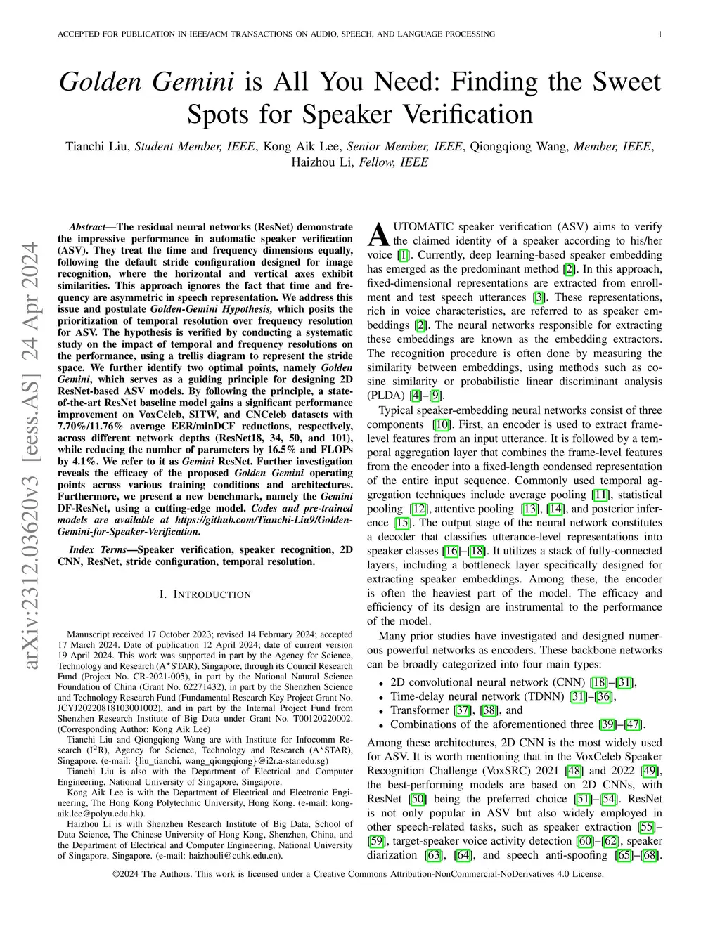 Previous studies demonstrate the impressive performance of residual neural networks (ResNet) in speaker verification. The ResNet models treat the time and frequency dimensions equally. They follow the default stride configuration designed for image recognition, where the horizontal and vertical axes exhibit similarities. This approach ignores the fact that time and frequency are asymmetric in speech representation. In this paper, we address this issue and look for optimal stride configurations specifically tailored for speaker verification. We represent the stride space on a trellis diagram, and conduct a systematic study on the impact of temporal and frequency resolutions on the performance and further identify two optimal points, namely Golden Gemini, which serves as a guiding principle for designing 2D ResNet-based speaker verification models. By following the principle, a state-of-the-art ResNet baseline model gains a significant performance improvement on VoxCeleb, SITW, and CNCeleb datasets with 7.70%/11.76% average EER/minDCF reductions, respectively, across different network depths (ResNet18, 34, 50, and 101), while reducing the number of parameters by 16.5% and FLOPs by 4.1%. We refer to it as Gemini ResNet. Further investigation reveals the efficacy of the proposed Golden Gemini operating points across various training conditions and architectures. Furthermore, we present a new benchmark, namely the Gemini DF-ResNet, using a cutting-edge model.